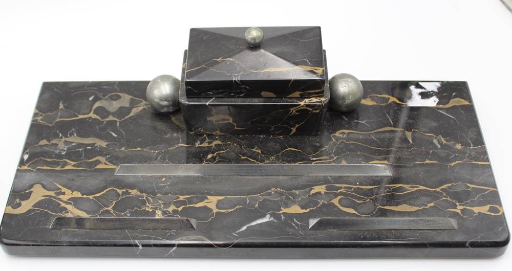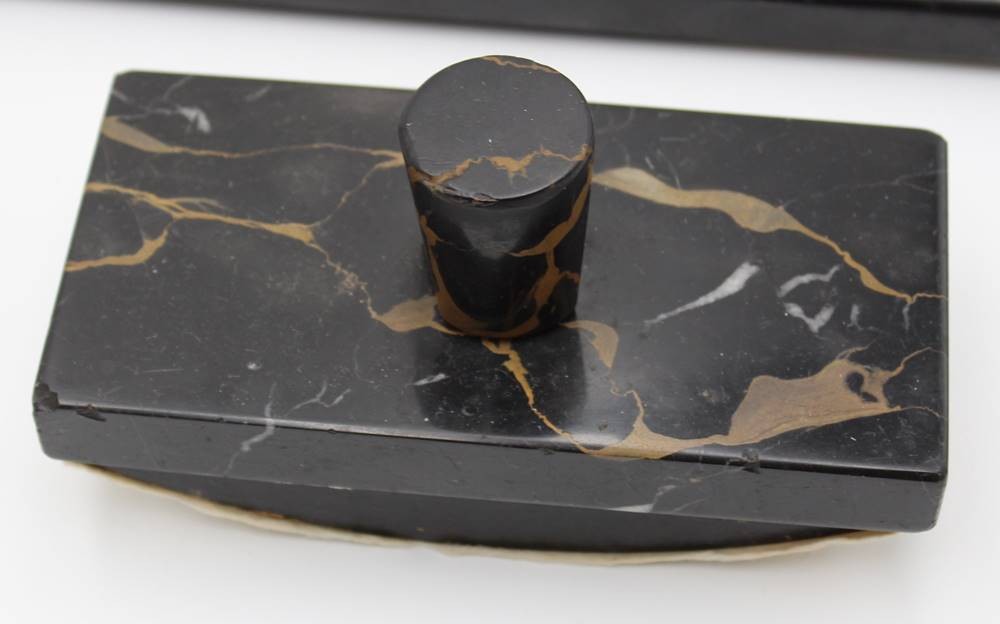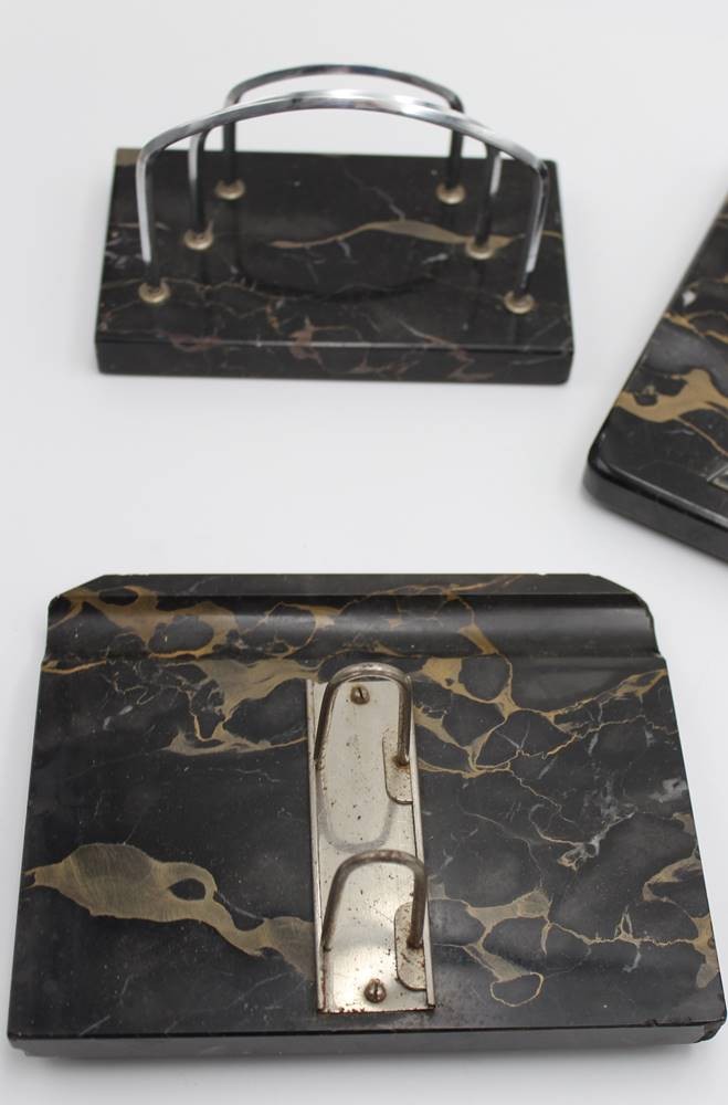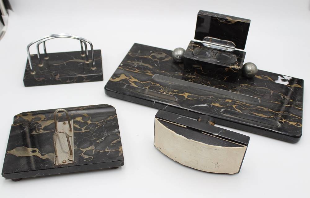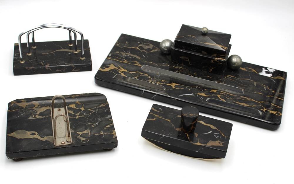 4tlg. Schreibtisch-Garnitur, Marmor, wohl um 1930/40, div. kl. Abplatzer, gr. Ablage ca. 38,5 x 17,5cm [1]