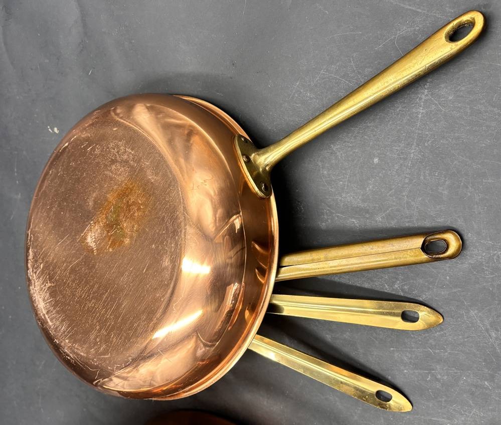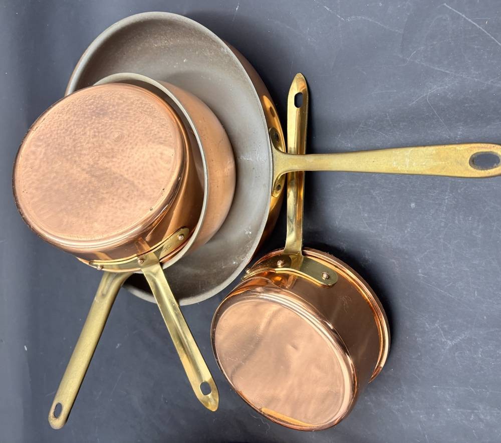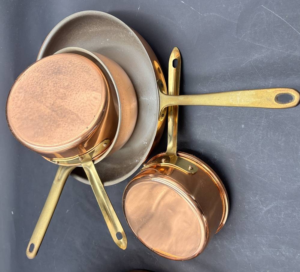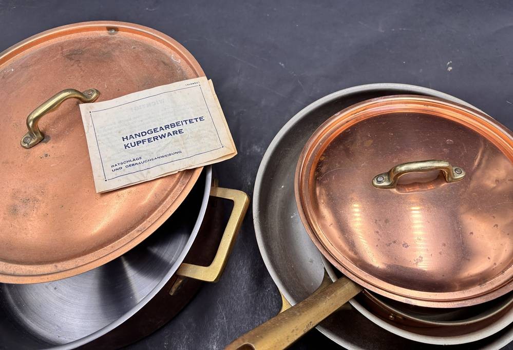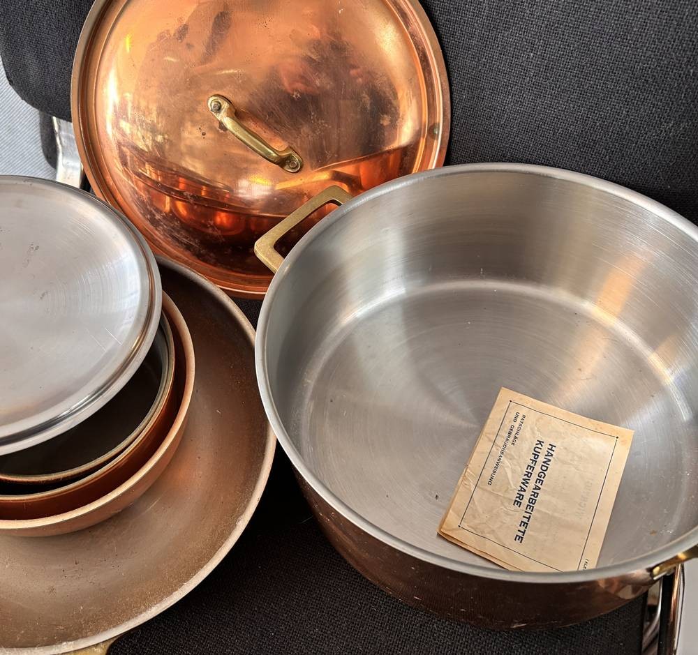 5 Teile Kupfer/Messing Küchengeräte, Deckeltopf, Stieltöpfe, 1 gr. Pfanne, 1x mit Pflegeanleitung, wohl unbenutzt? aber ungepflegter Kellerfund [1]