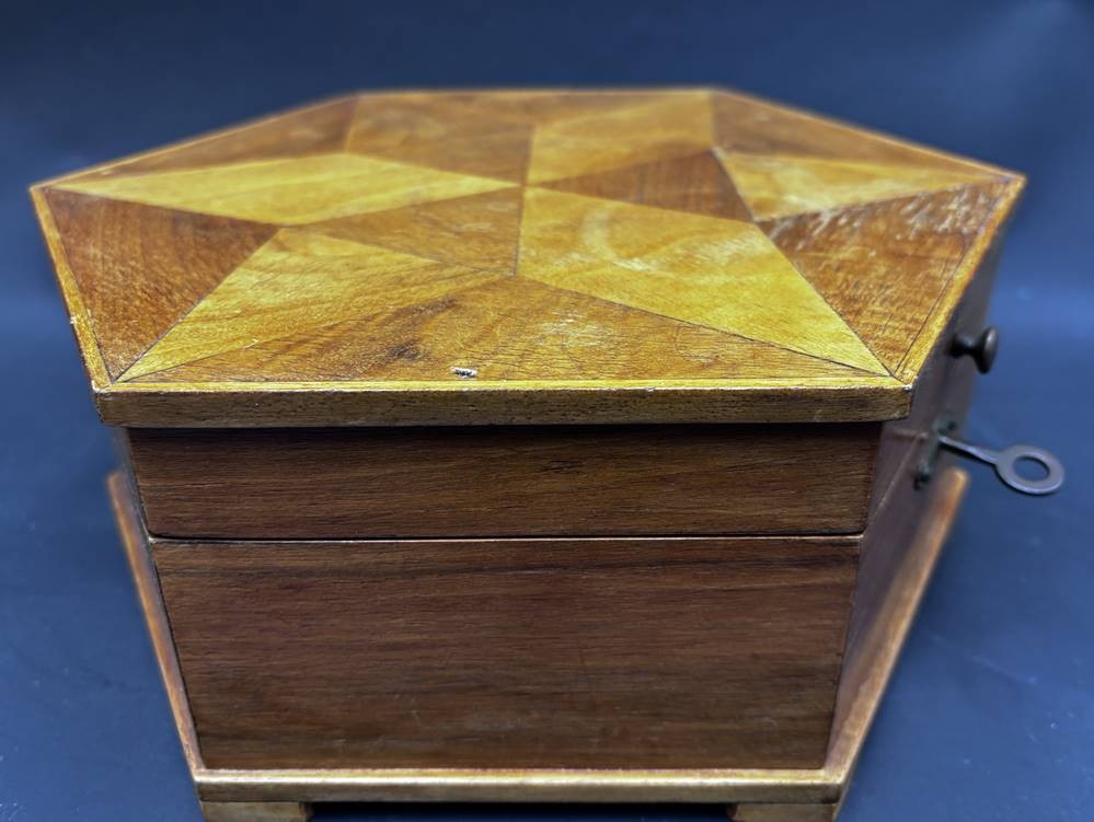 6-eckiger Holzkasten, intarsiert, mit Schlüssel, innen Spiegel und Einteilung, D-21 cm