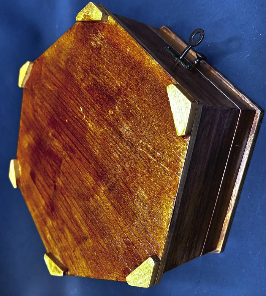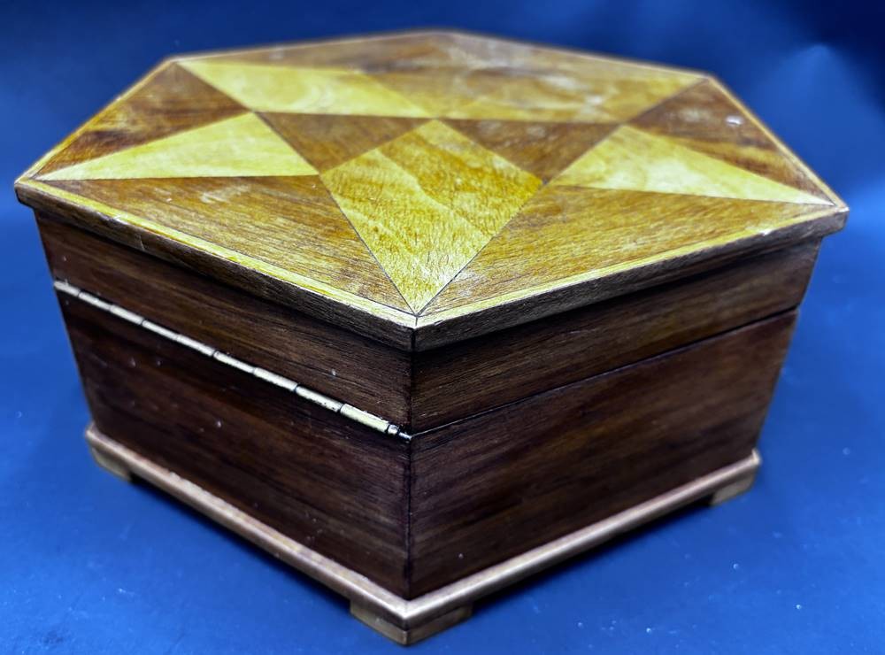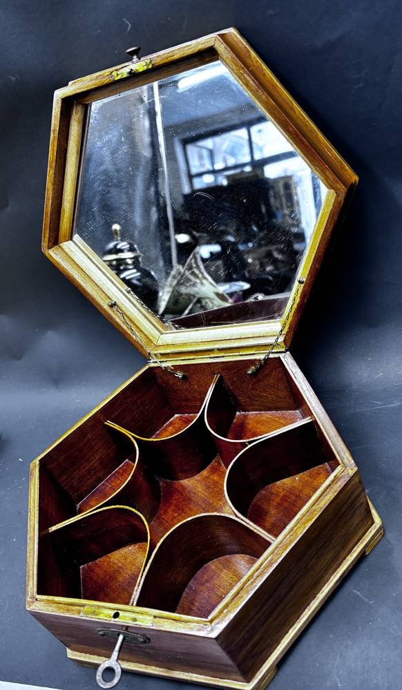 6-eckiger Holzkasten, intarsiert, mit Schlüssel, innen Spiegel und Einteilung, D-21 cm [1]