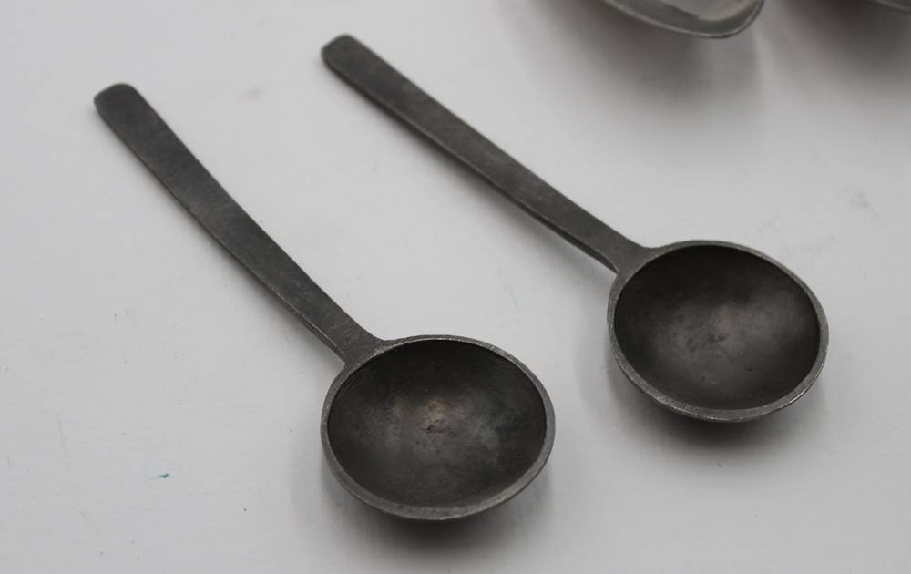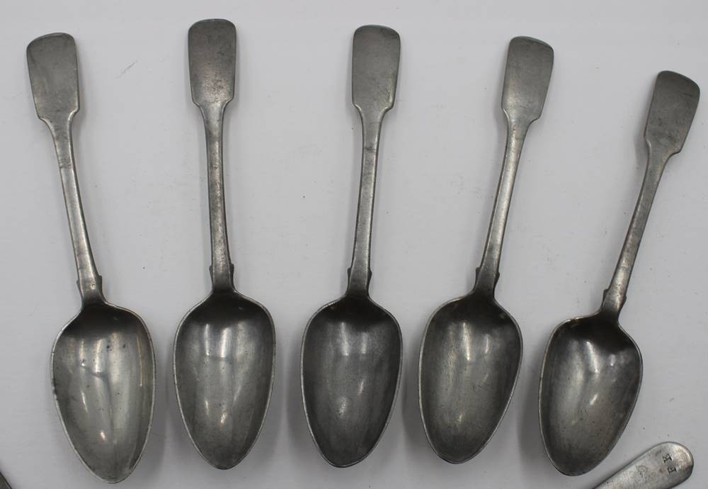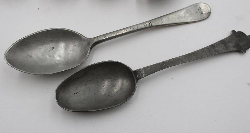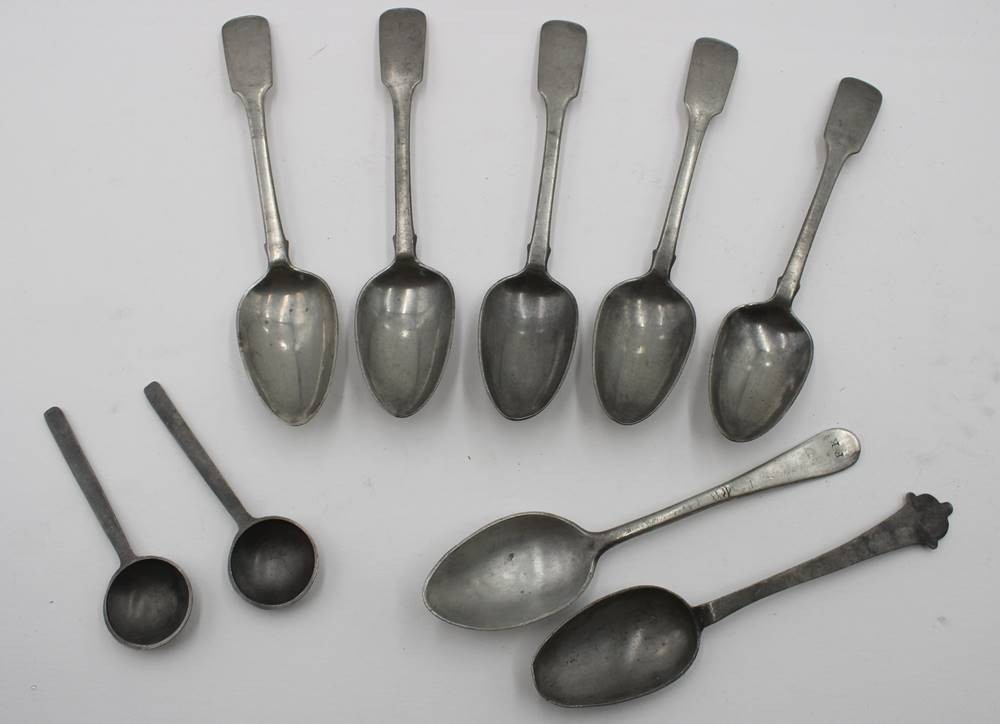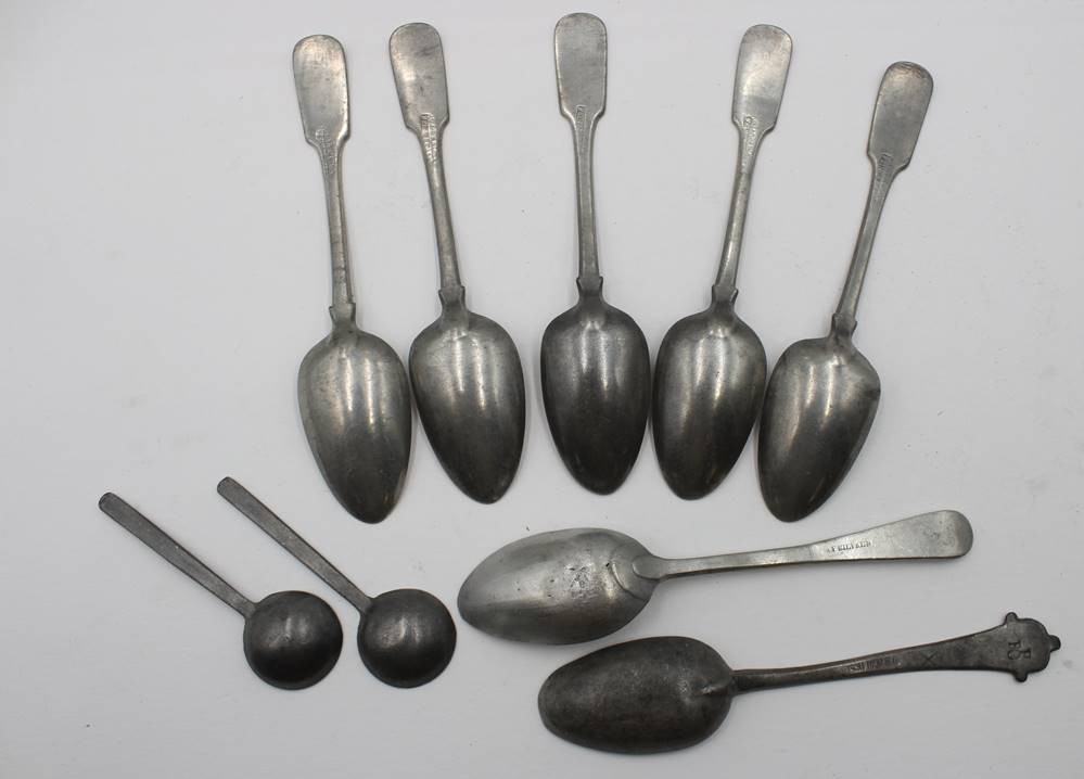 9x div. Zinn-Löffel, 18./19. Jhd., teilw. Altersspuren, ca. L-12 bis 21,5cm [1]