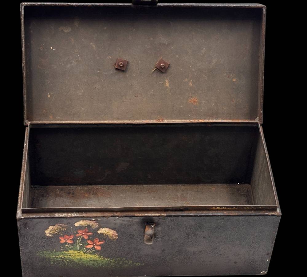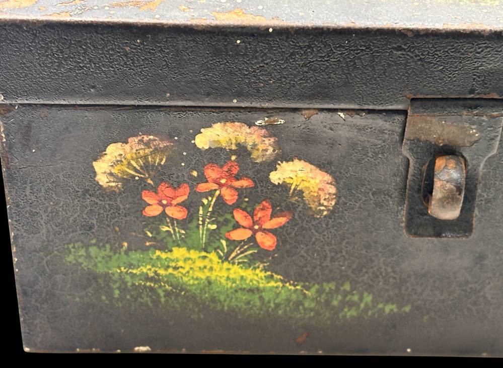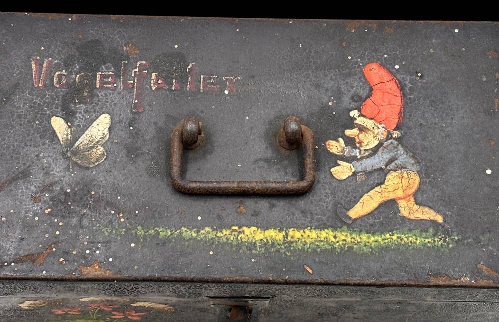 alte Blechdose, handbemalt "Vogelfutter" beschriftet, ungepflegter Kellerfund, H-11 cm, 22x11 cm [1]