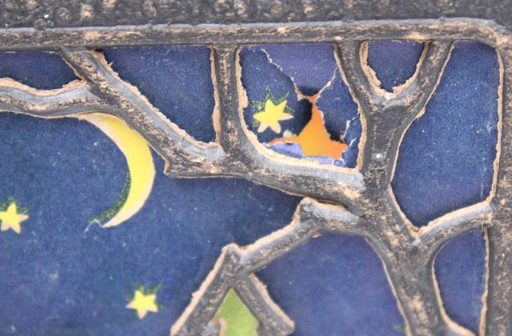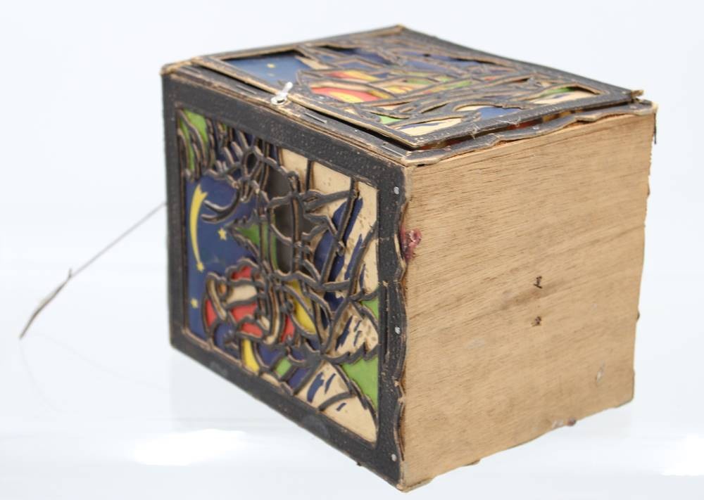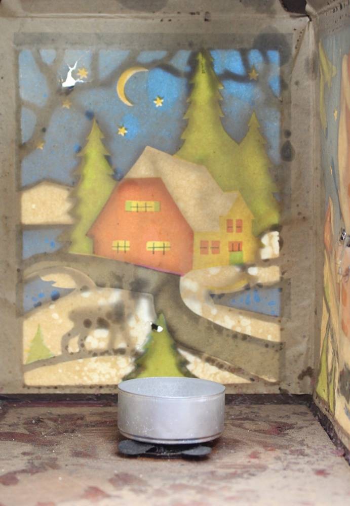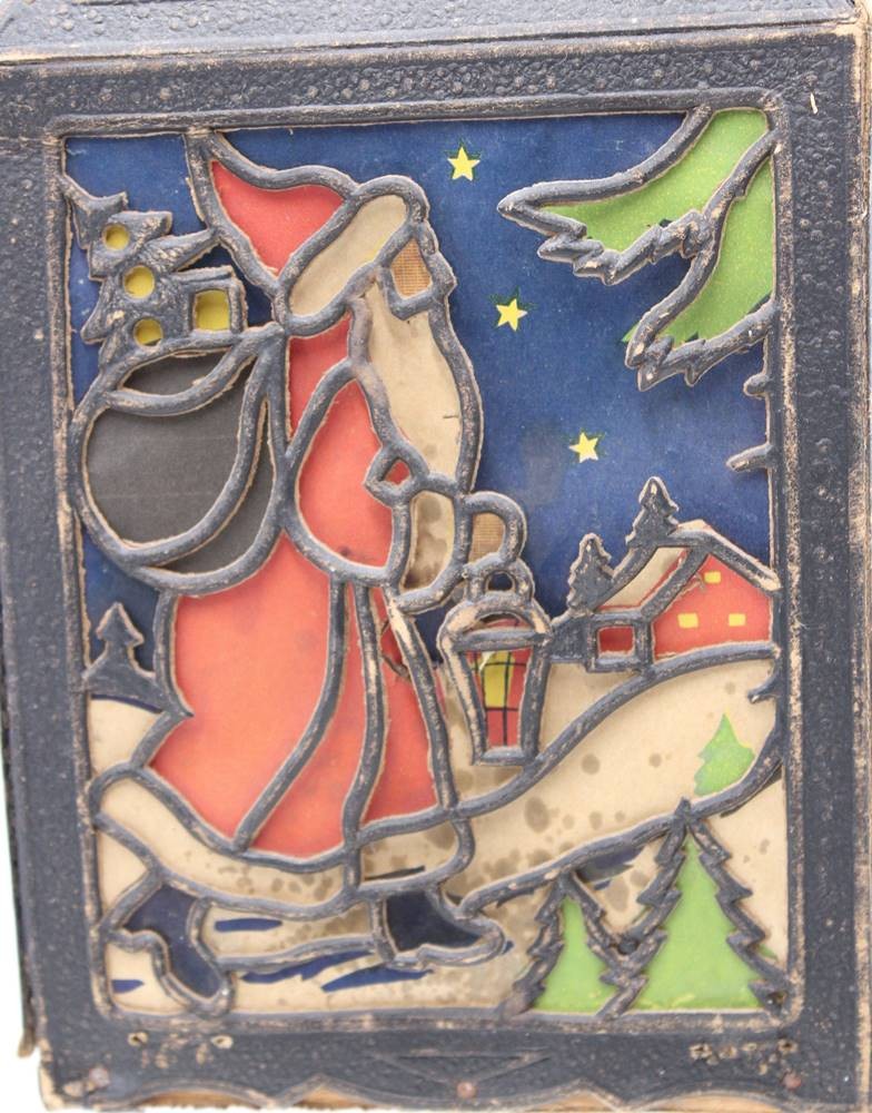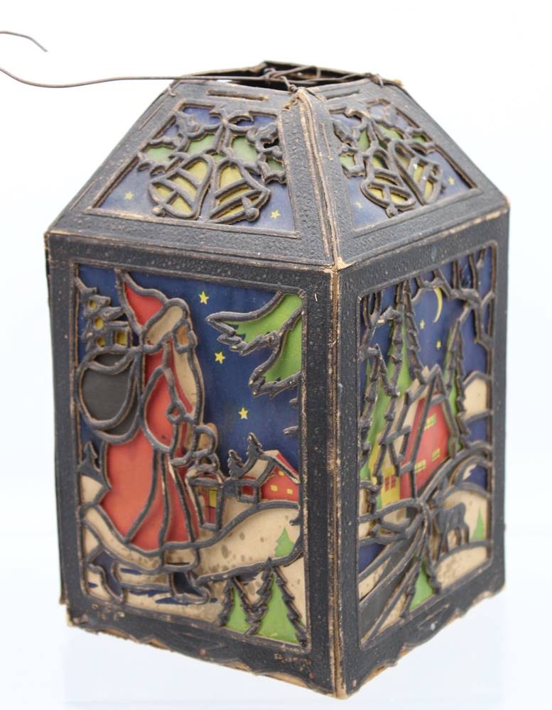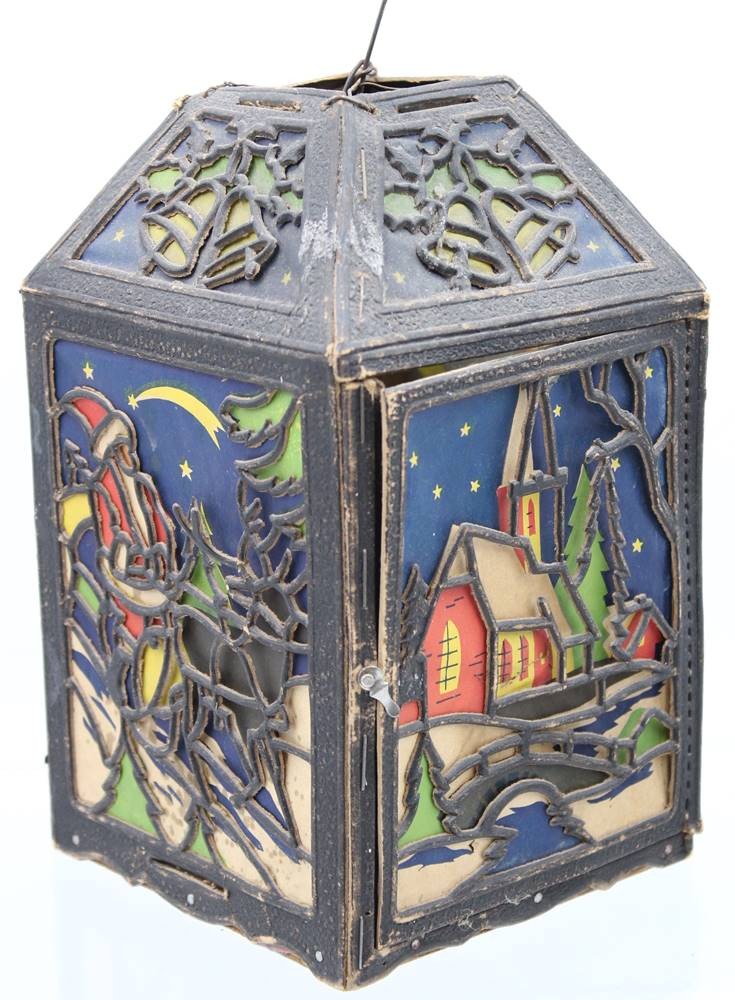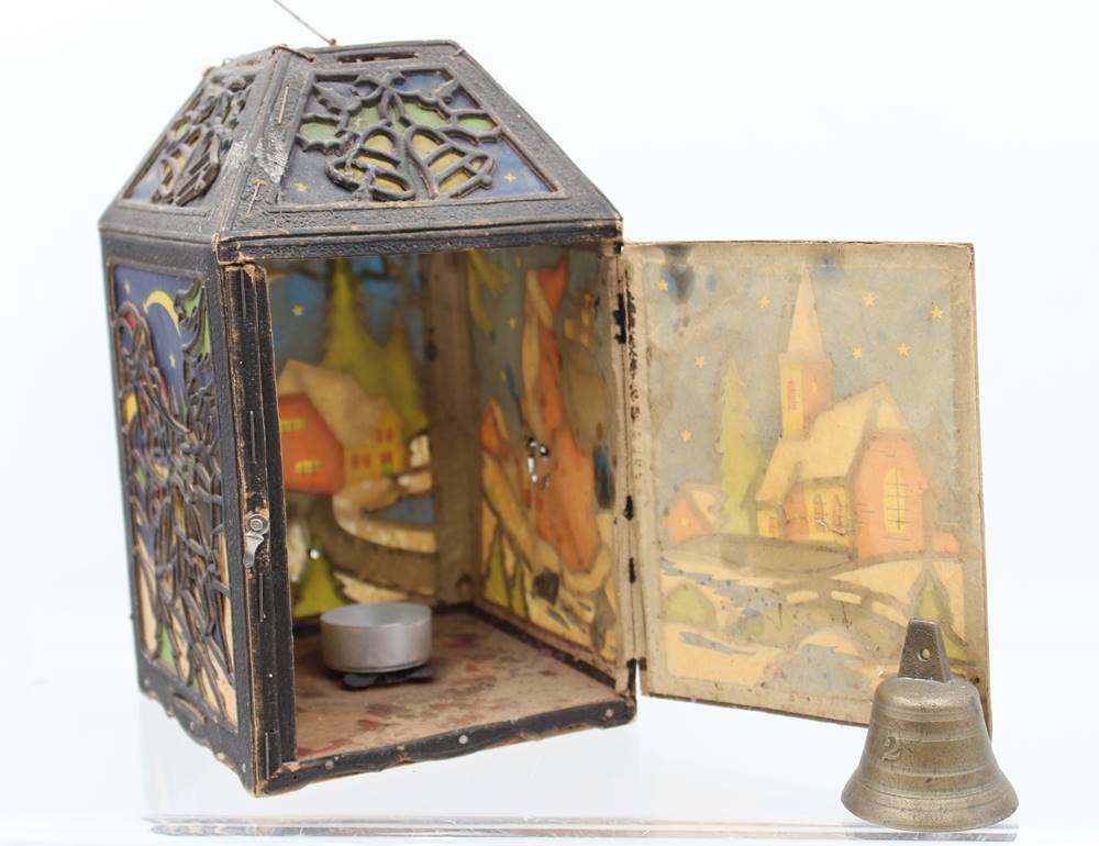 alte Weihnachtslaterne, Pappe, div. kl. Beschädigungen, anbei kl. Messing-Glocke, ca. H-23,5cm [1]