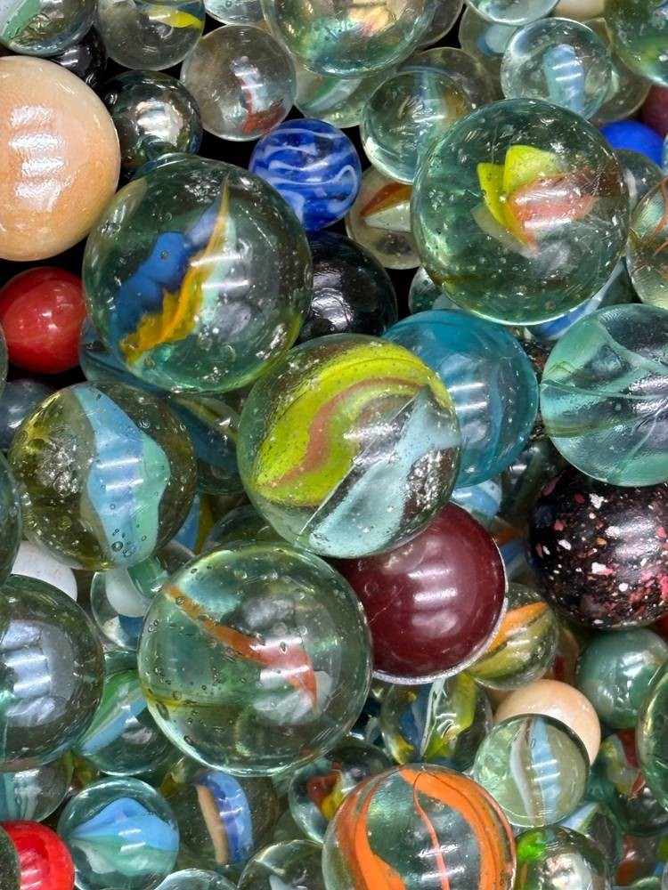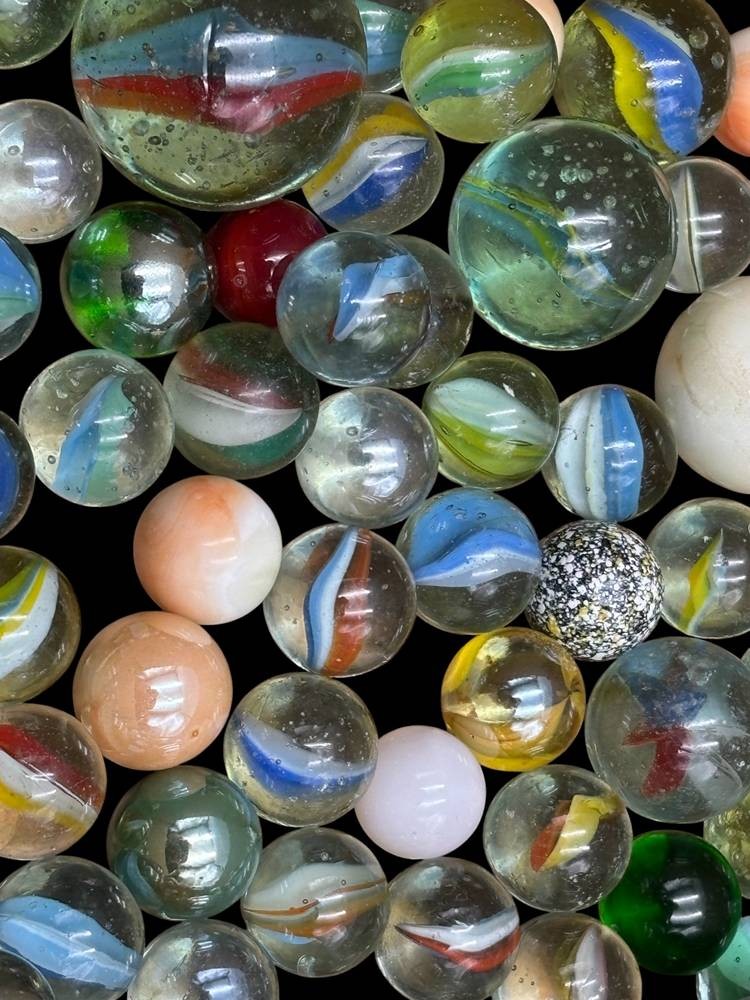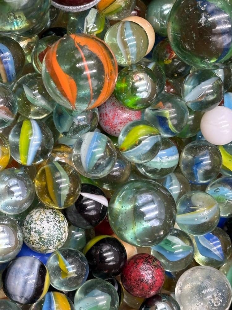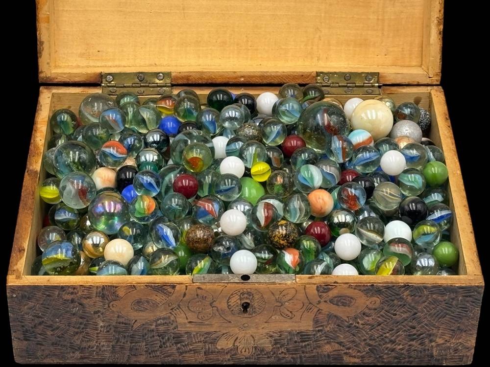 alter Holzkasten mit Brandmalerei, voller alter Glasmurmeln, verschiedene Grössen, über 100 Stück, H-9 cm, 17x24 cm [1]