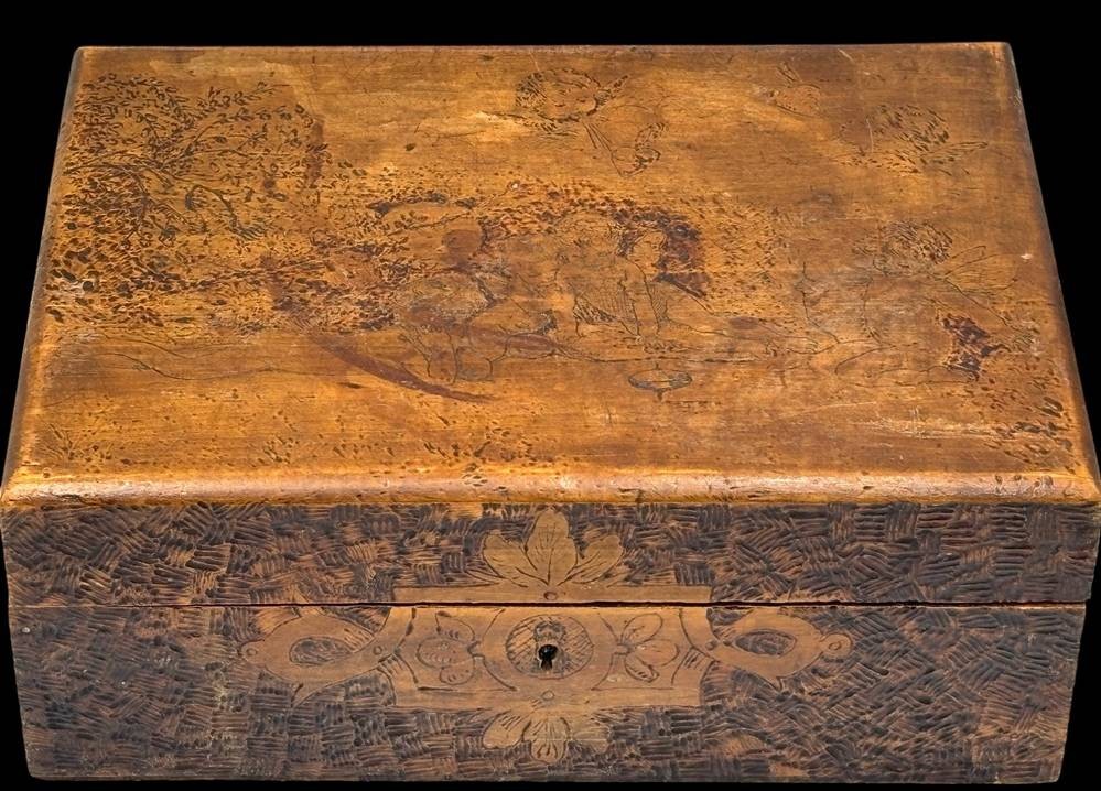 alter Holzkasten mit Brandmalerei, voller alter Glasmurmeln, verschiedene Grössen, über 100 Stück, H-9 cm, 17x24 cm