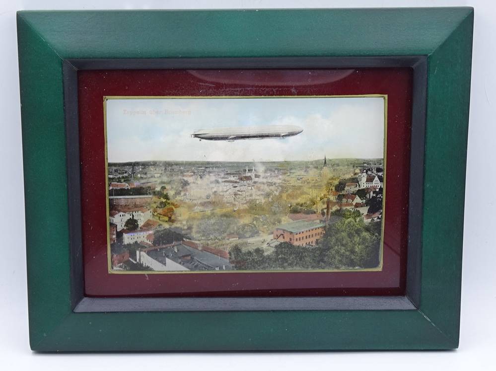 Ansichtskarte "Zeppelin über Bromberg" mit Perlmutteinlagen im Rahmen, 18x23cm
