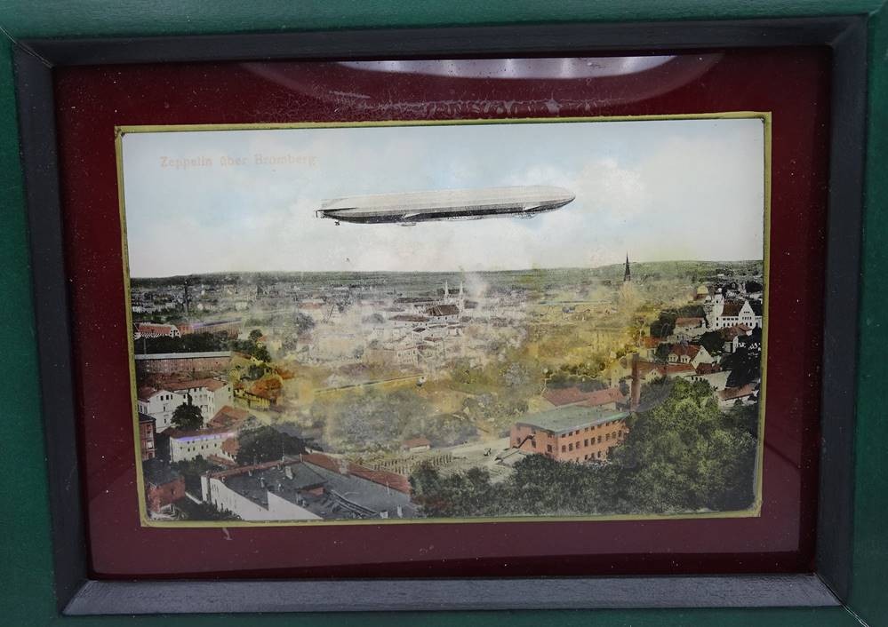 Ansichtskarte "Zeppelin über Bromberg" mit Perlmutteinlagen im Rahmen, 18x23cm [1]