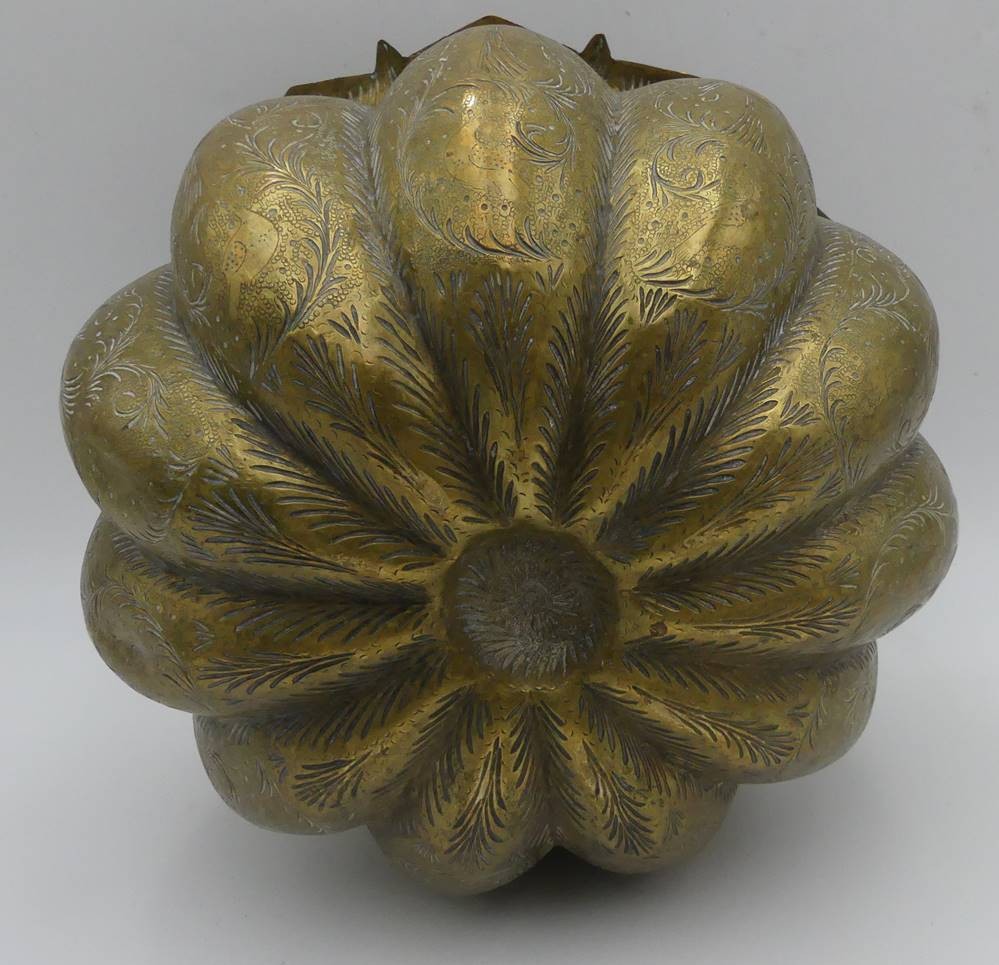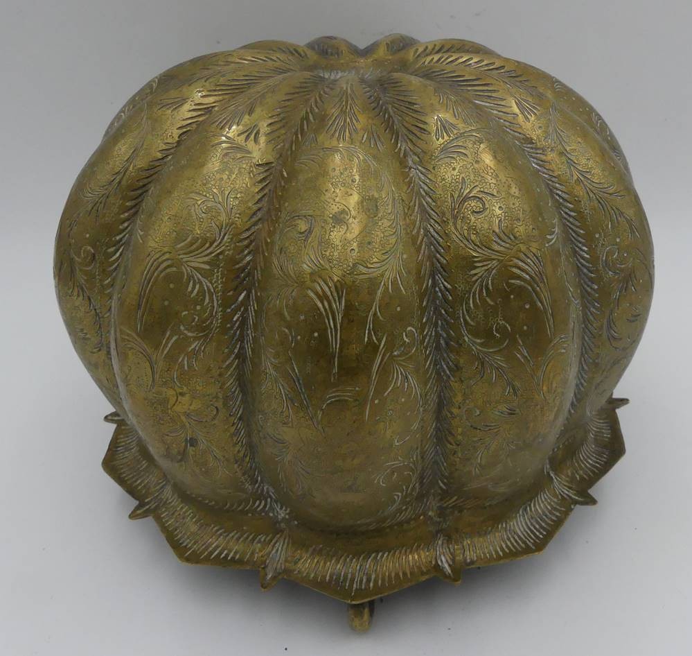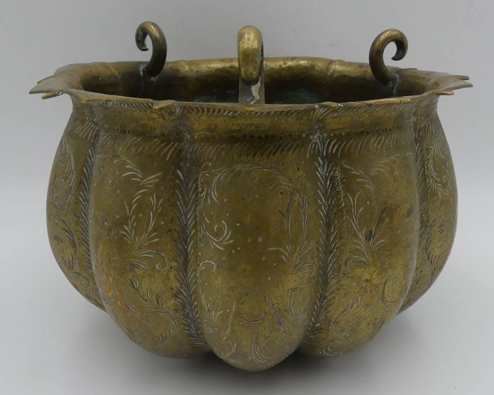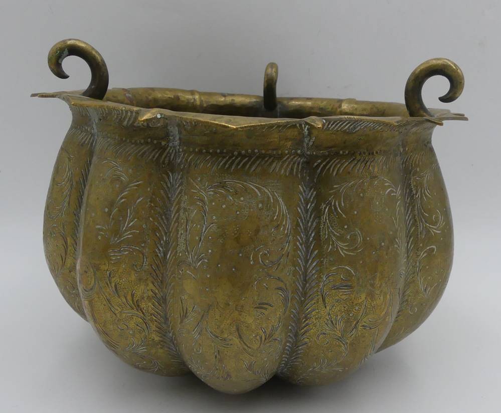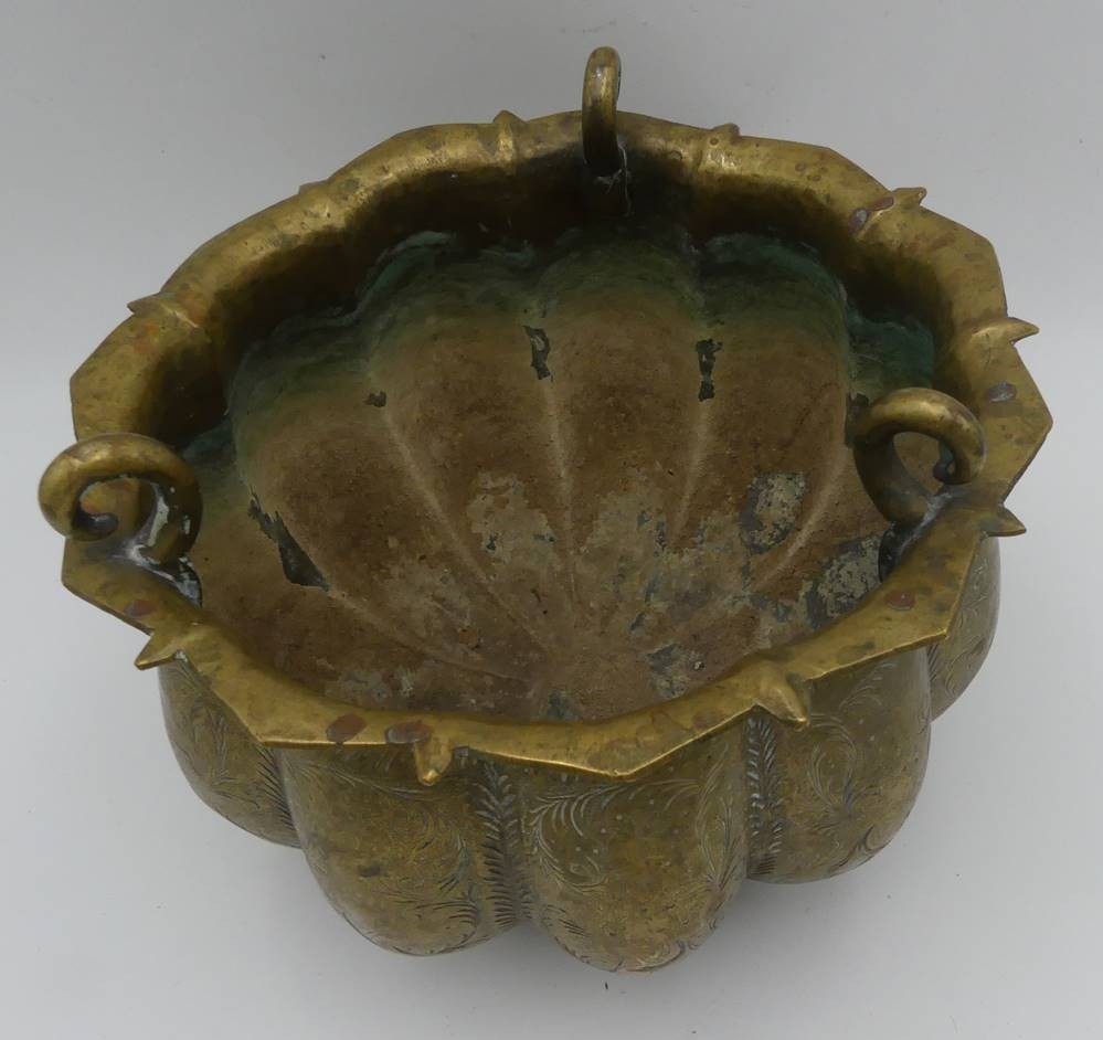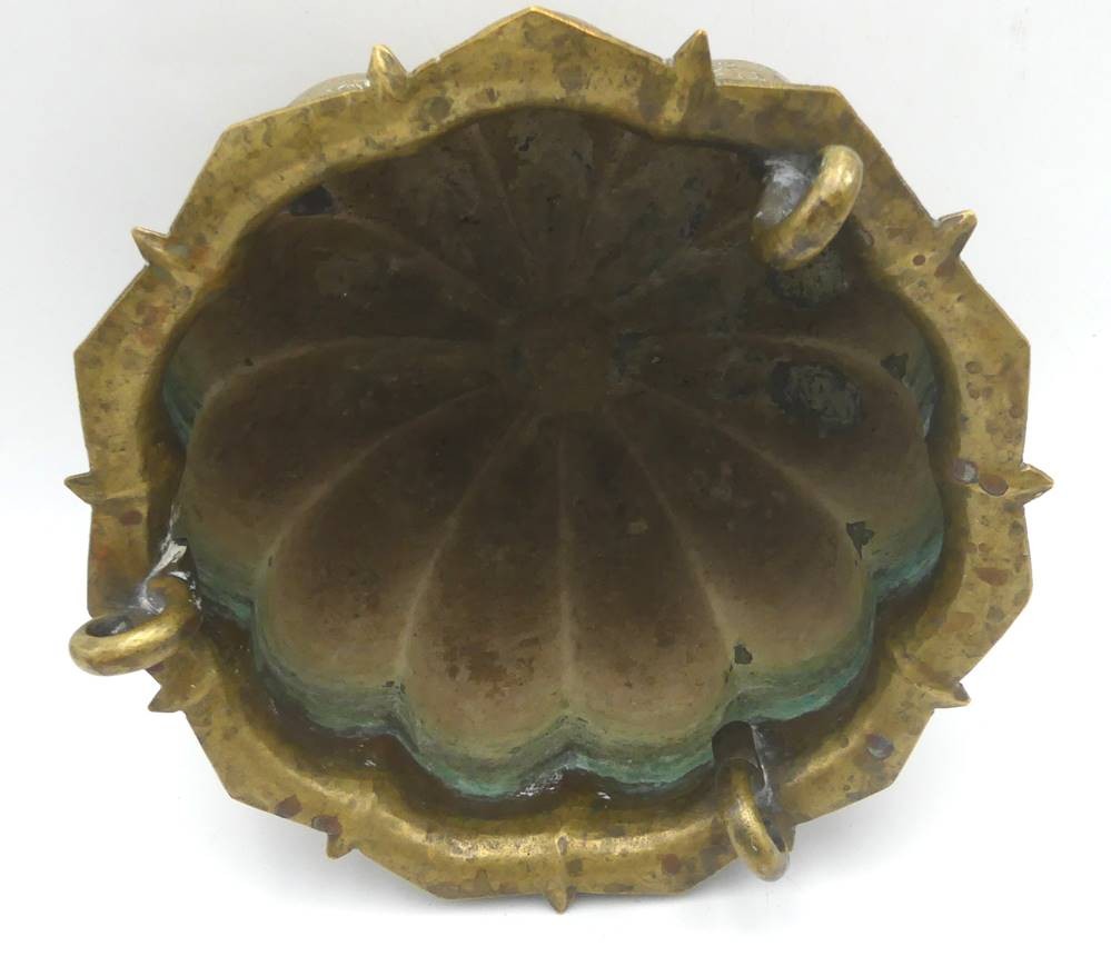 antike Blumenampel oder ähnliches, massives Messing reich verziert, 3 Haken, 19.Jhd.H-17 cm, D-22 cm [1]