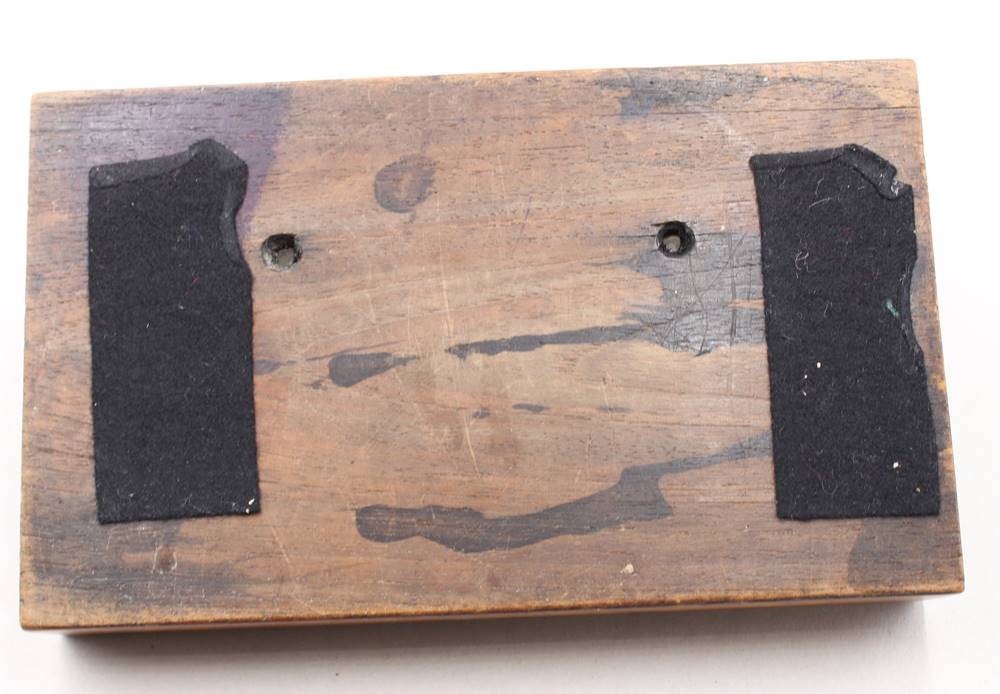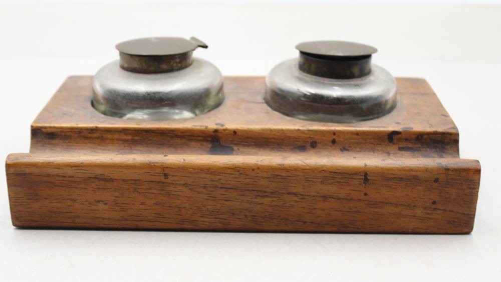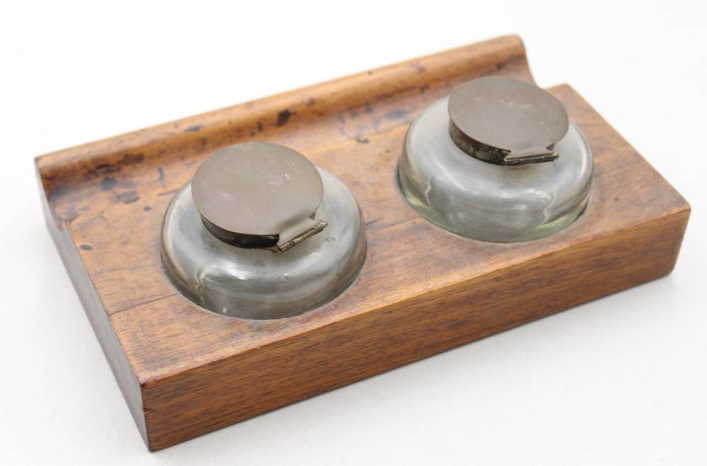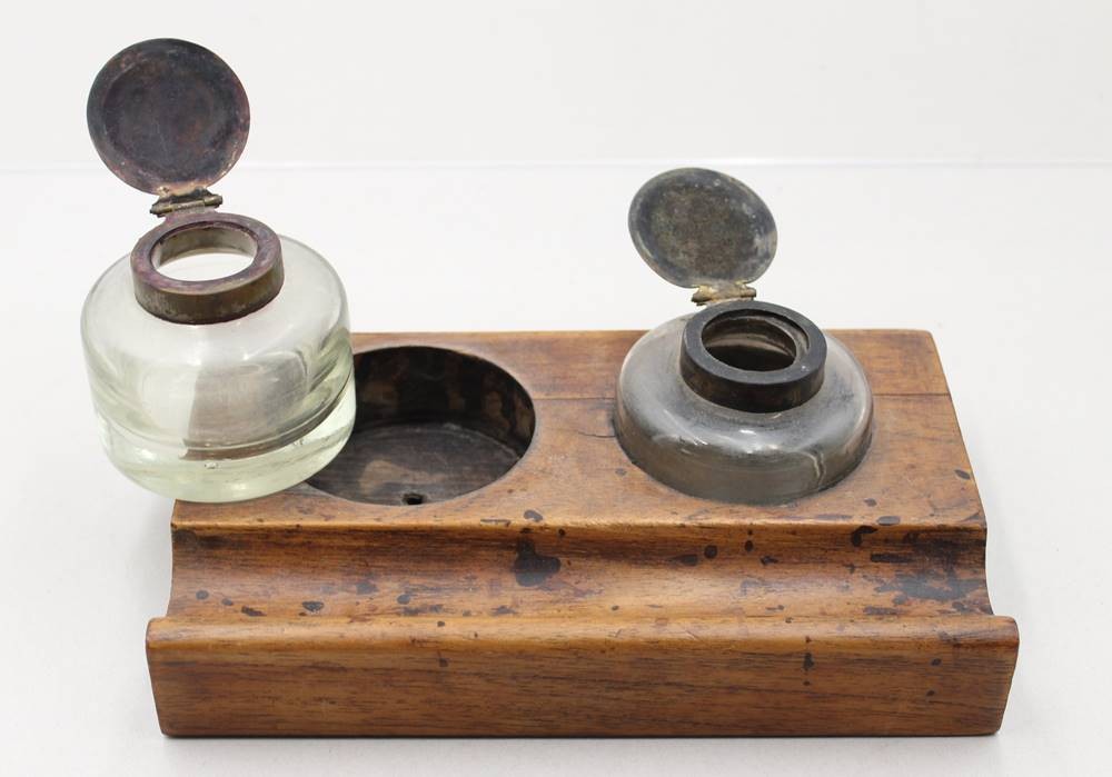 antike Schreibgarnitur aus Holz, 2 gr. Tintenfässer, H- 8cm B-23,5cm T-14cm [1]