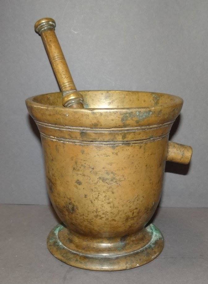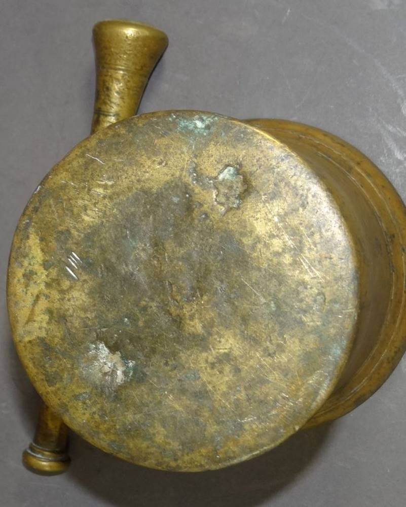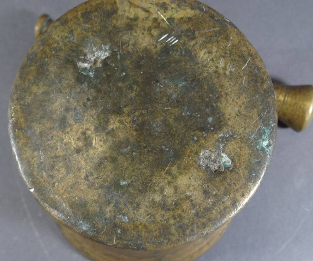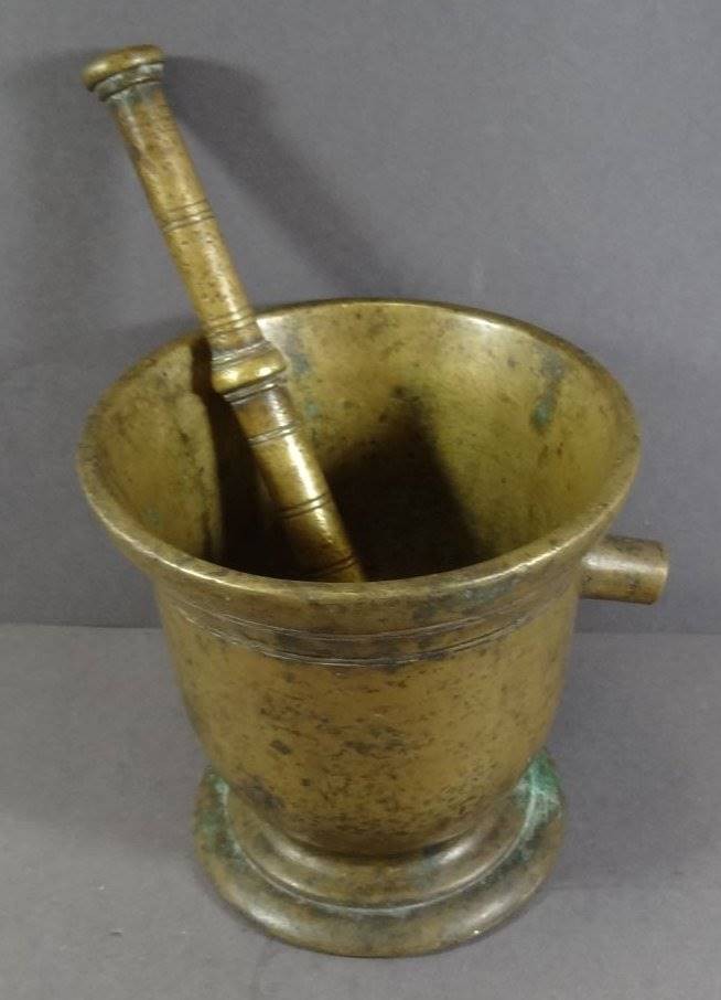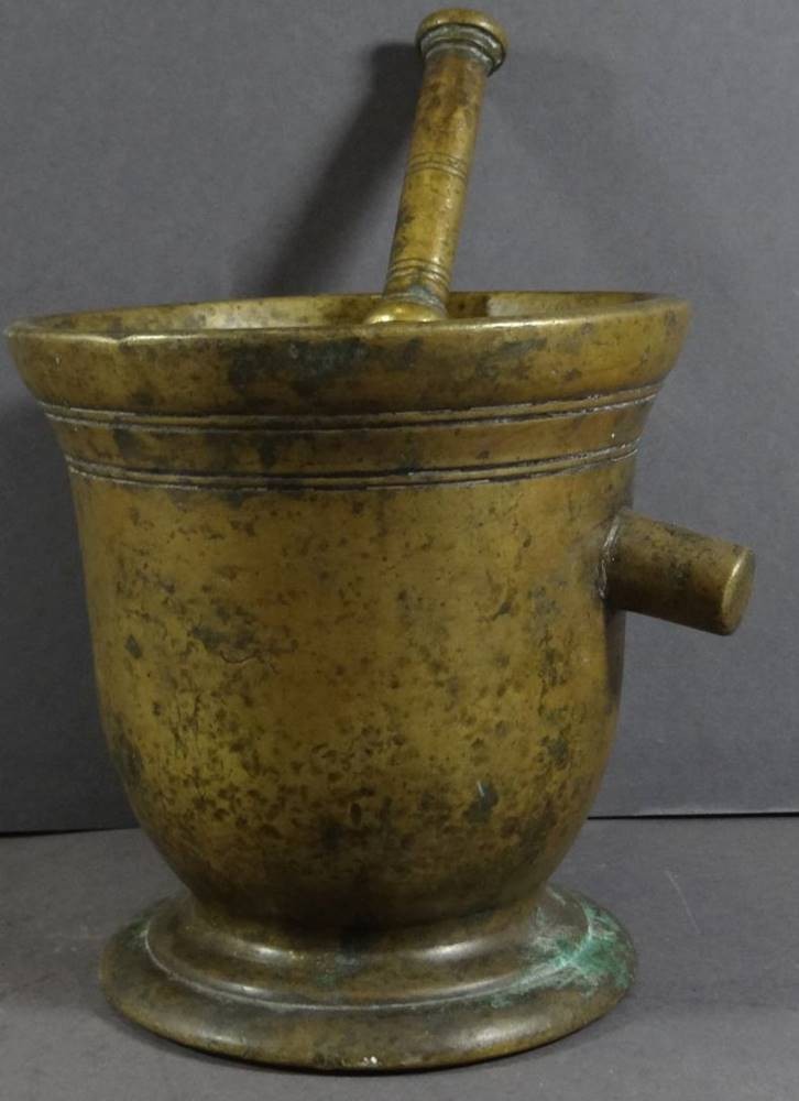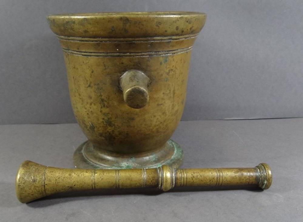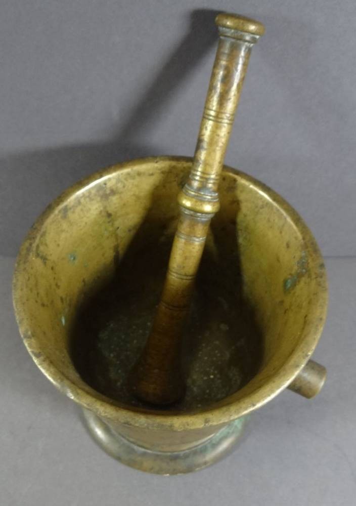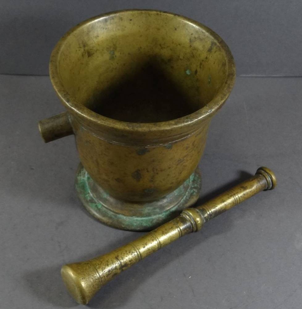 antiker Bronze-Mörser mit Pistell, 18./19. Jhd,, einzelne Handhabe, patiniert, H-14 cm, D-13 cm [1]