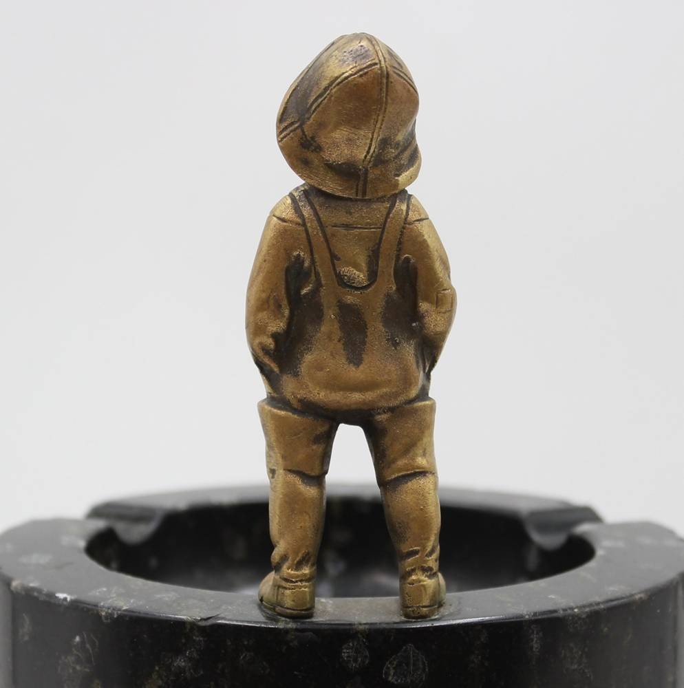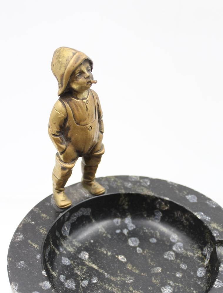 Aschenbecher aus schwarzem Marmor mit einer Bronzefigur eines kleinen Jungen, um 1920/30, Adcher mit einigen kl. Abplatzern, ca. H-14cm D-14cm [1]