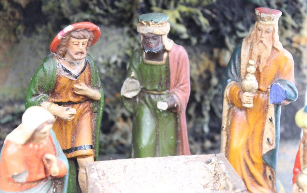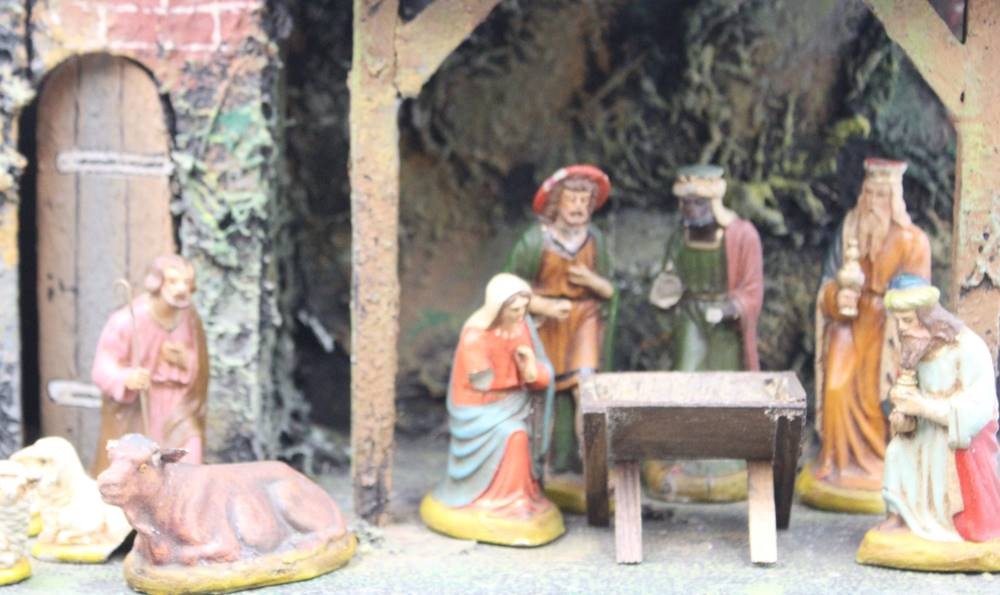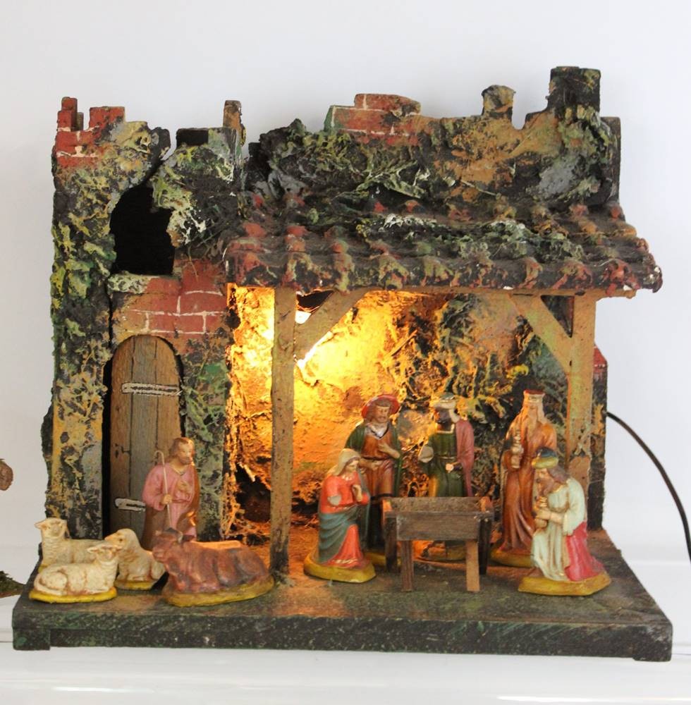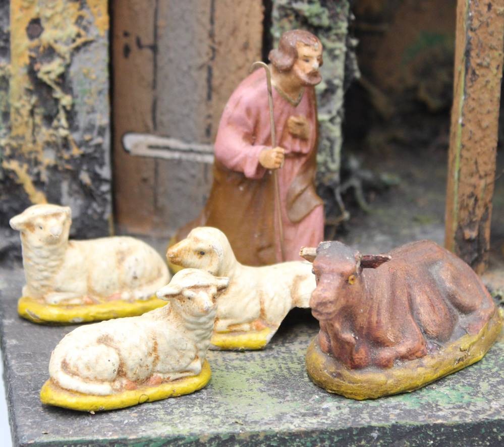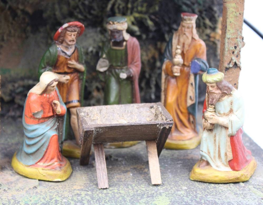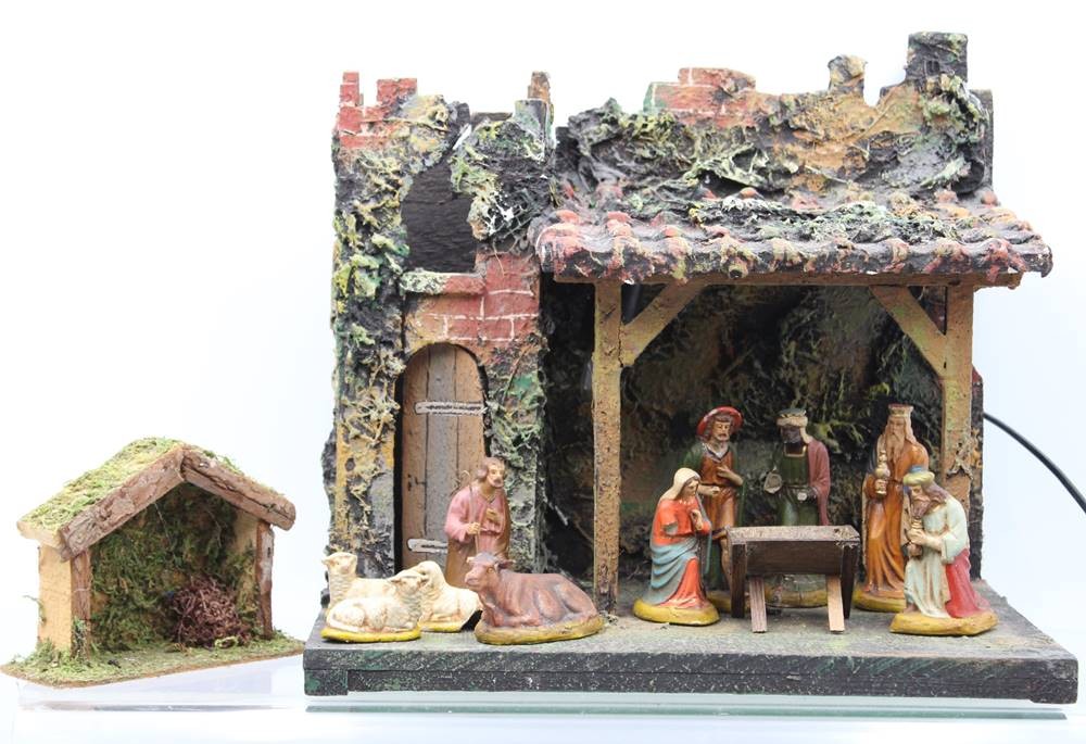 beleuchtbare Weihnachtsgrippe, älter, Massefiguren meist beschädigt, H-31cm B-35cm [1]