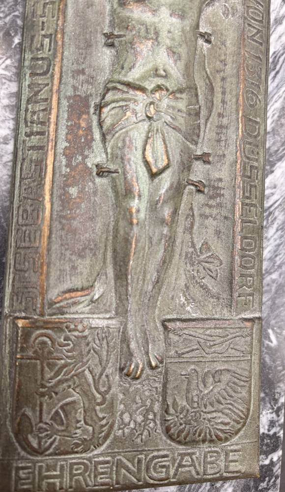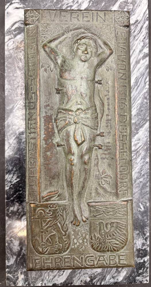 Bronze Reliefplatte auf Marmor, Ehrengabe des Schützenvereines St. Sebastian von 1316, Düsseldorf, 22x11 cm [1]
