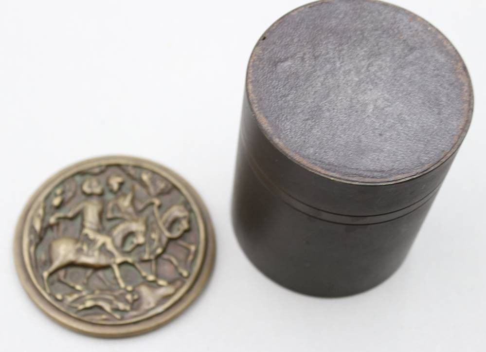 Deckeldose, Deckel reliefiert, Bronze, ca. H-10,2cm D-8,5cm [1]