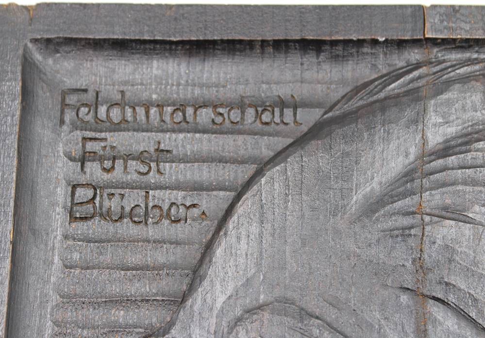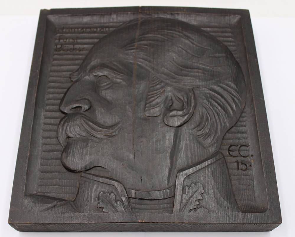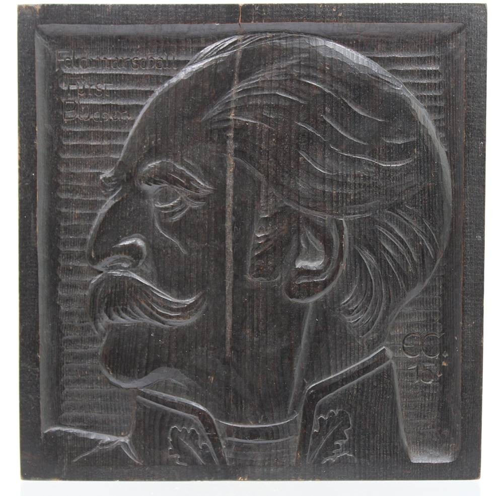 E.C.1915 Holzplatte mit Portrait "von Blücher", altrissig, , 26x25,5 cm, T-ca. 3,8 cm [1]