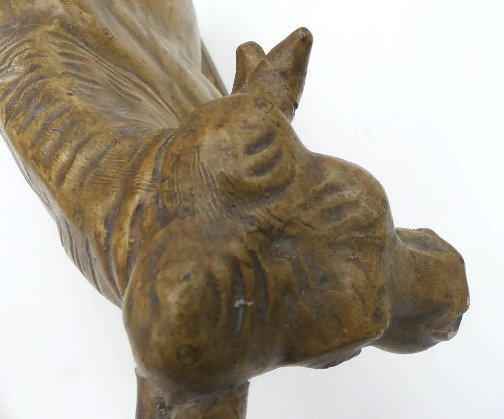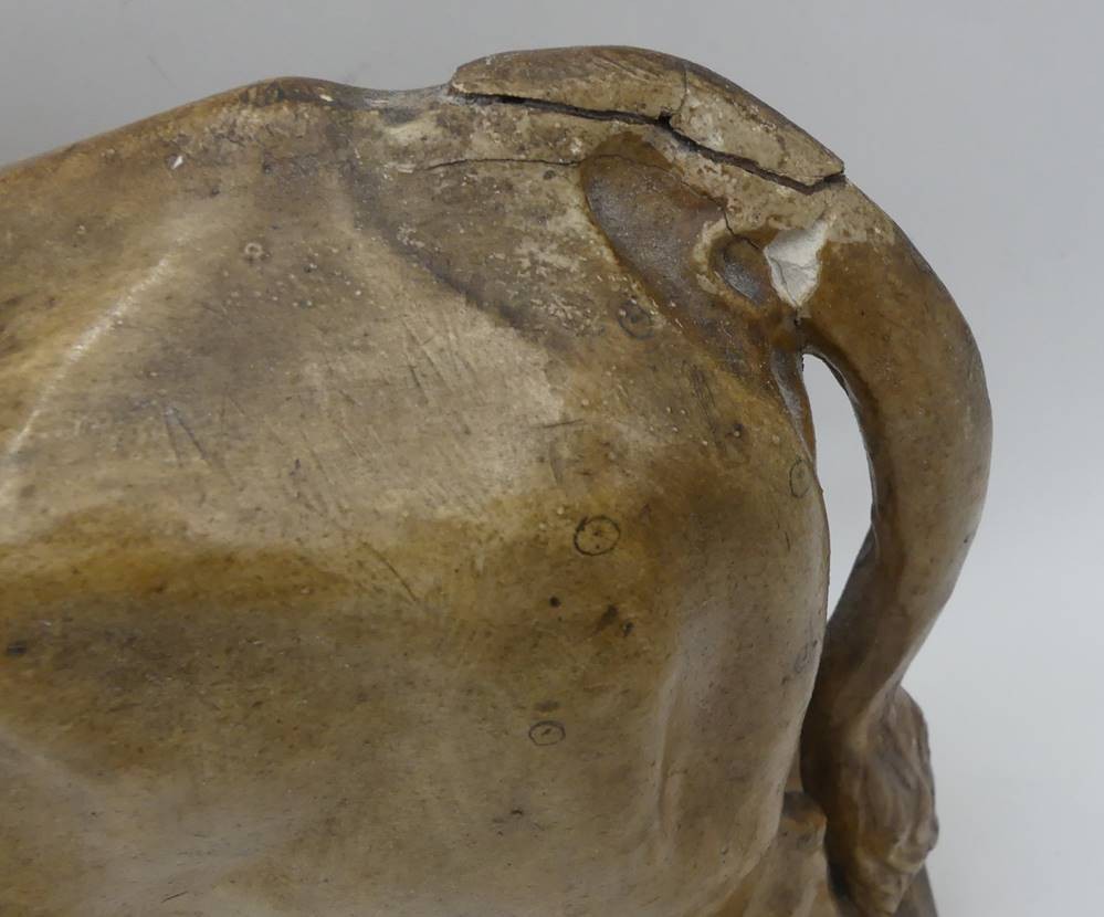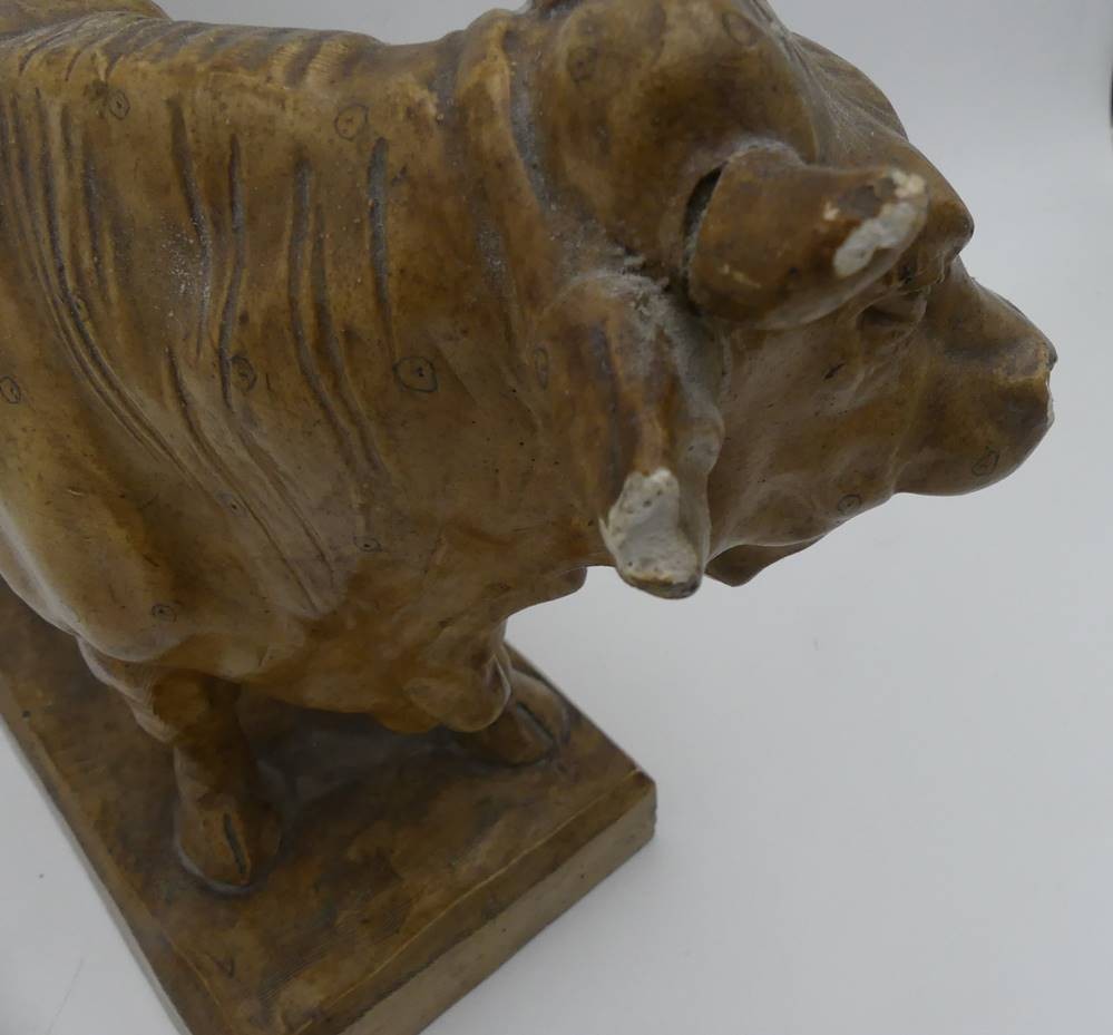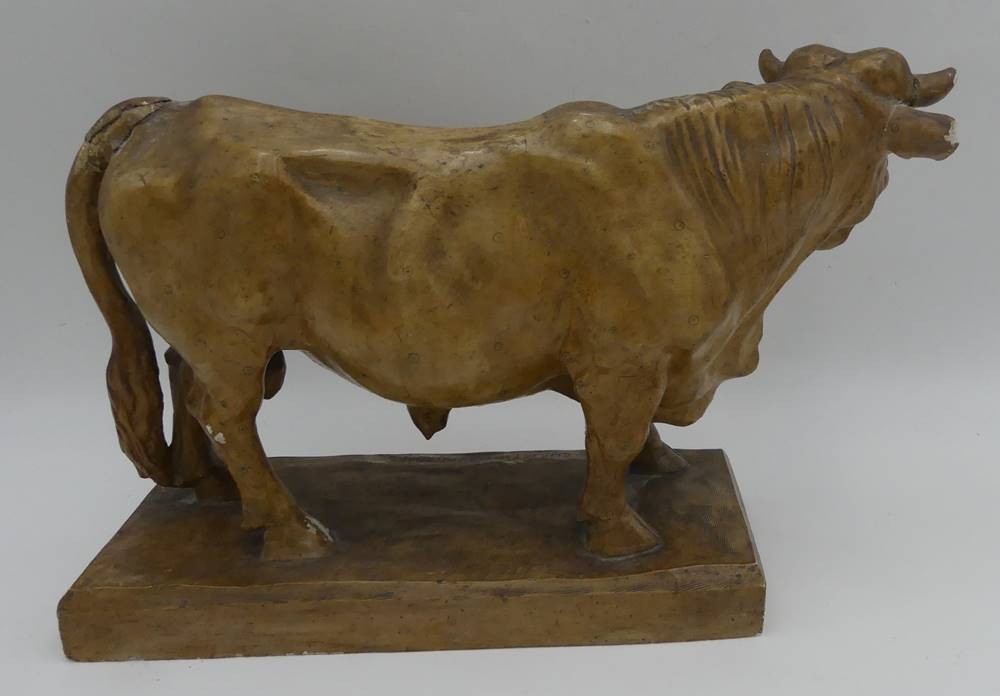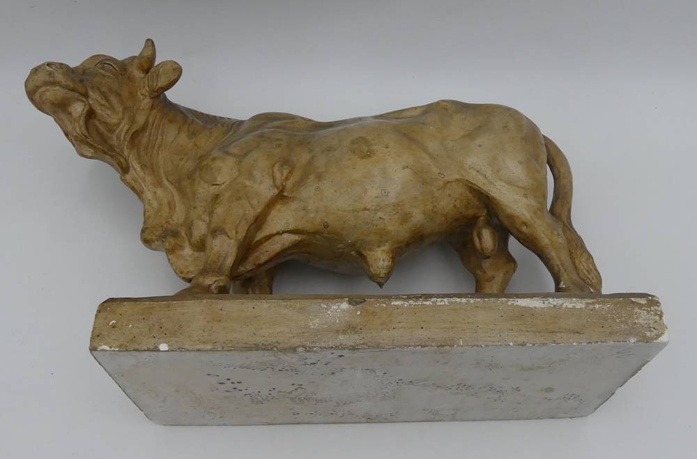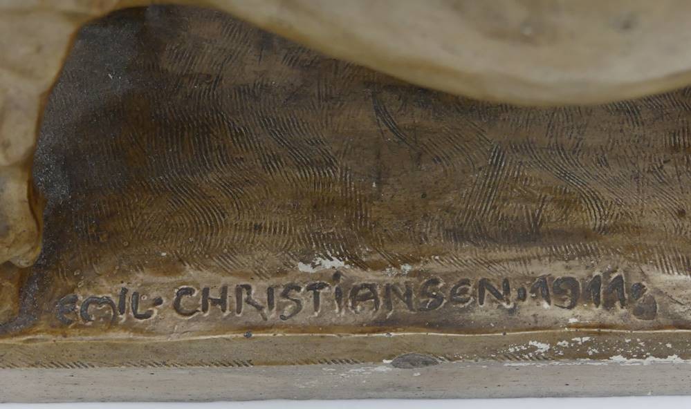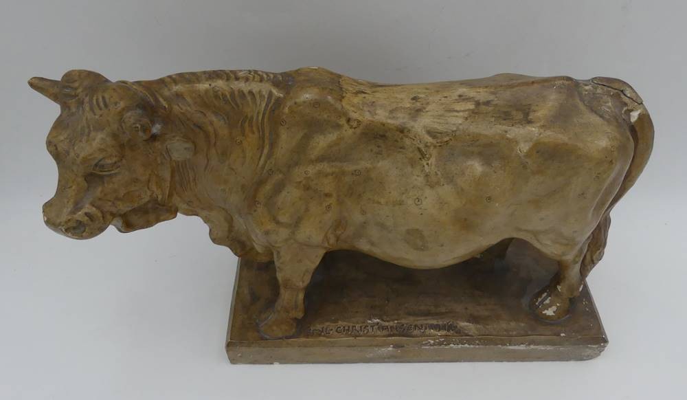Figur eines Stieres, sign. Emil Christiansen, 1914, aus Stuck, Altersspuren, Schweif geklebt, Abplatzer, H-22 cm, L-35 cm [1]