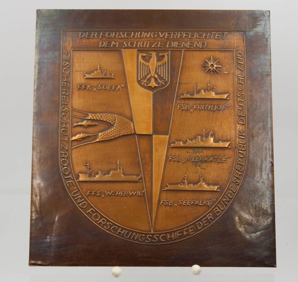 Gedenkplatte,Fischereischutzboote und Forschungsschiffe der Bundesrepublik Deutschland, Kupfer, ca. 25 x 23cm