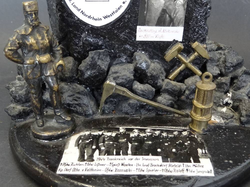 Gedenkstein aus Kohle für Verband deutscher Soldaten mit 2 Fotos sowie Bergmann Figur aus Bronze? und Werkzeug, H-20 cm, B-24 cm