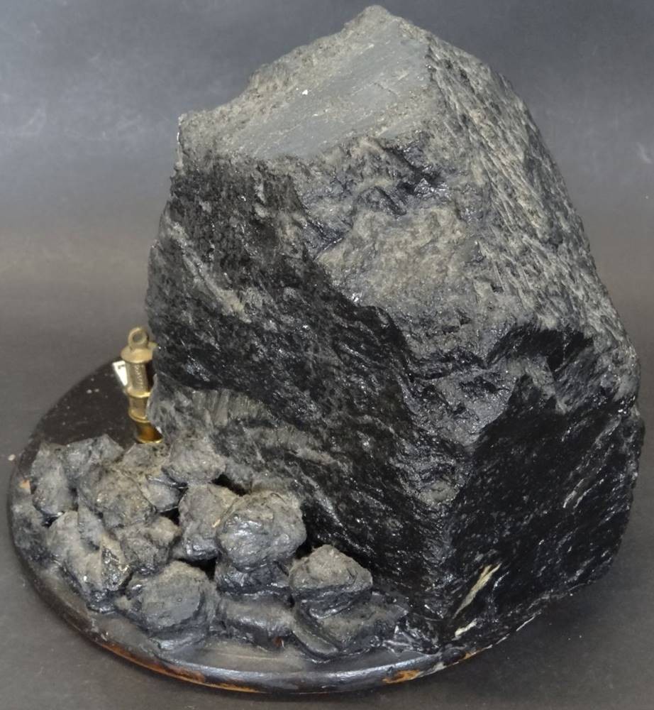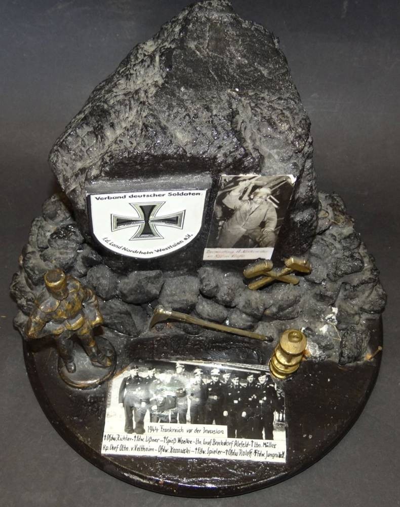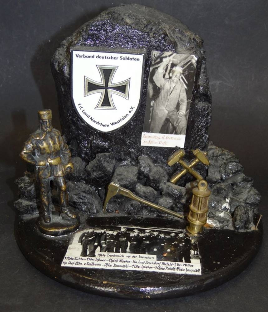 Gedenkstein aus Kohle für Verband deutscher Soldaten mit 2 Fotos sowie Bergmann Figur aus Bronze? und Werkzeug, H-20 cm, B-24 cm [1]
