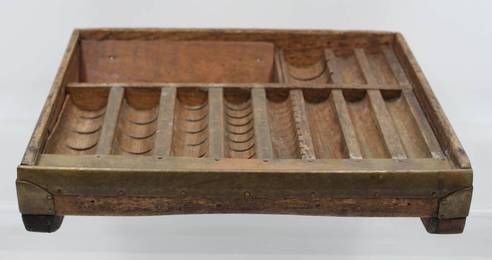 Geld-Zählkasse um 1900, Holz mit Messing-Kanten, -9 cm, 25x31 cm, [1]