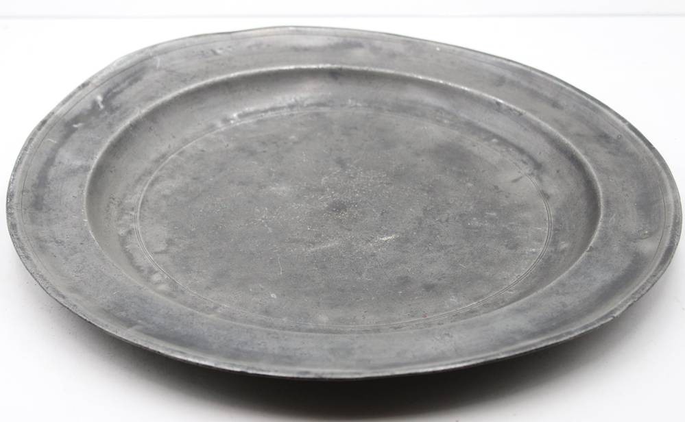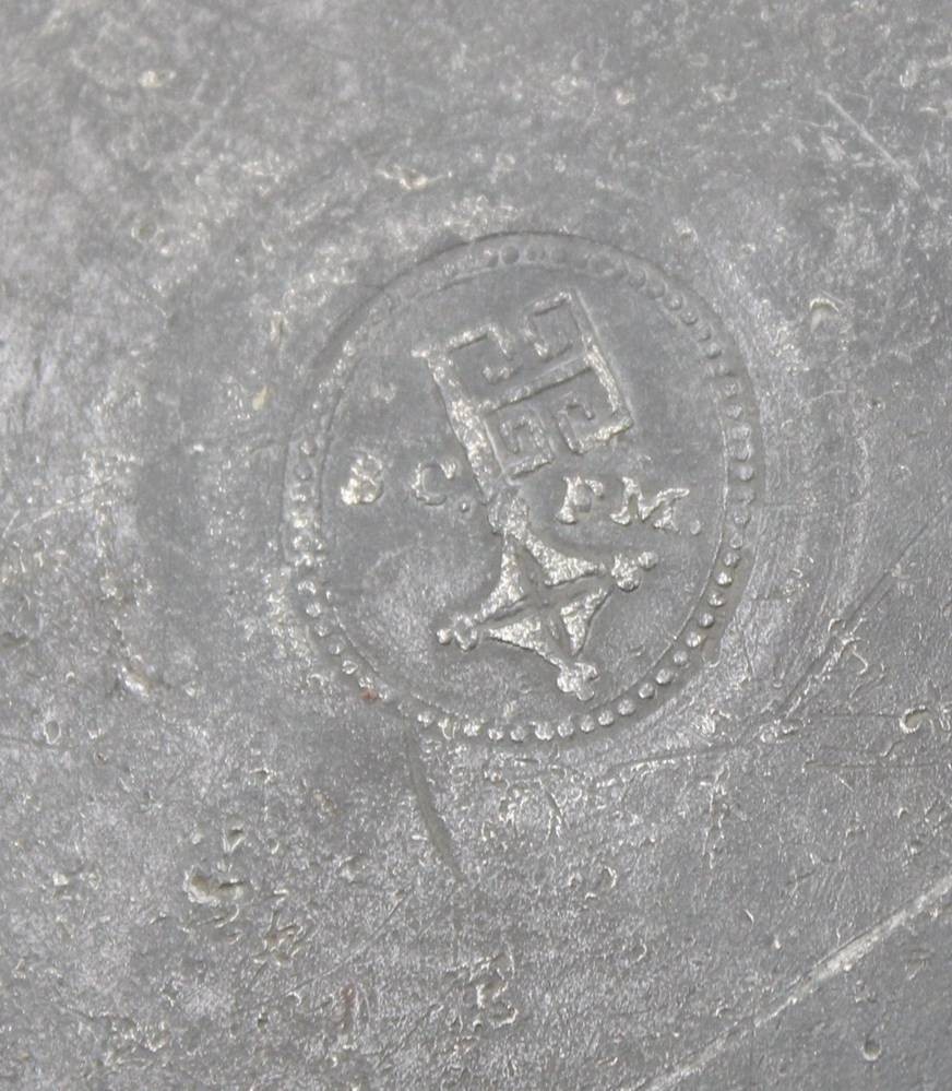 gr. antike Zinnplatte, monogrammiert, Altersspuren, wohl 18./19. Jhd. , ca. D-36cm [1]