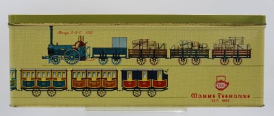 gr. Blechdose, Teekanne, Zugdekor, H-14cm B-37,5cm T-18cm [1]