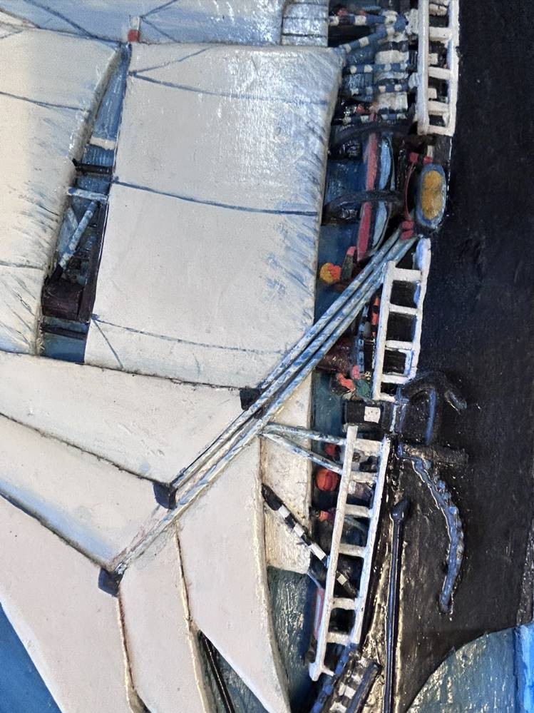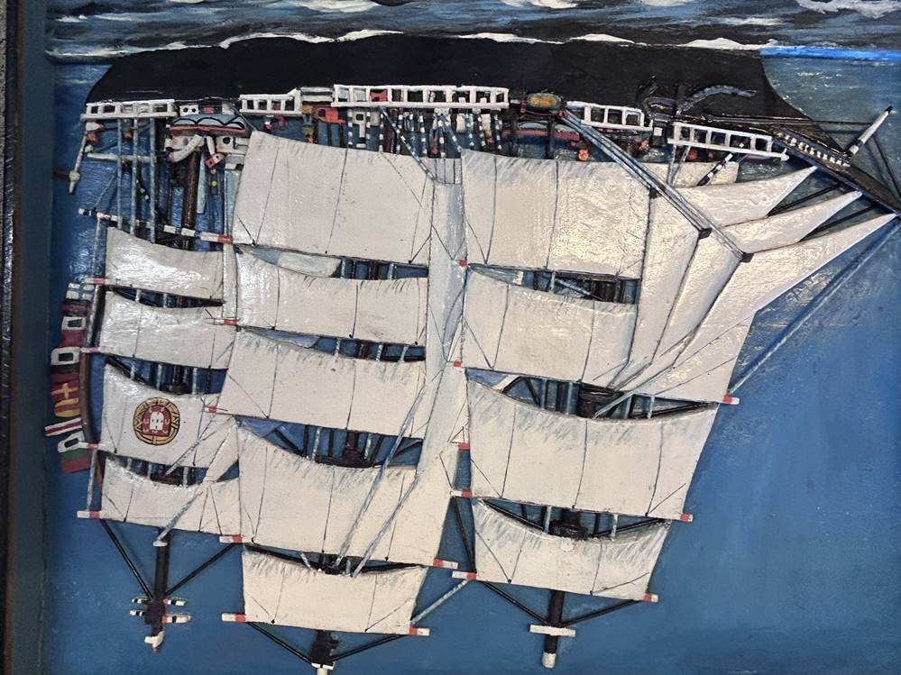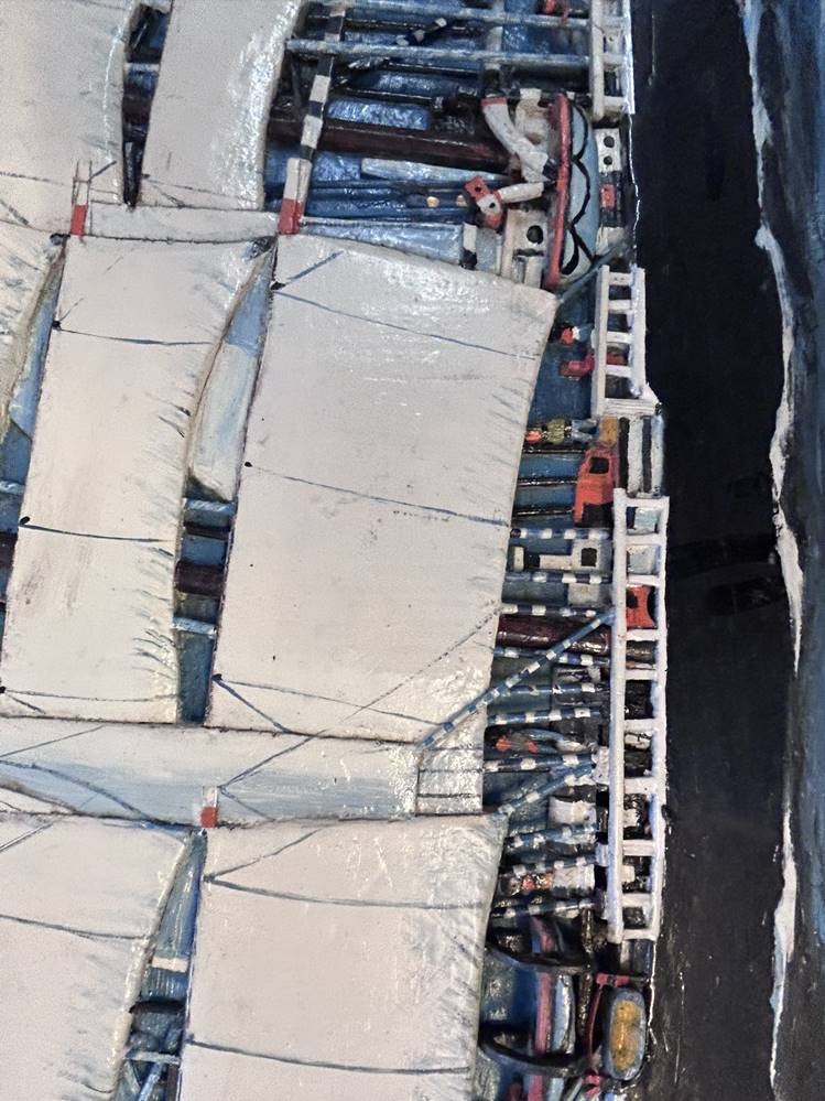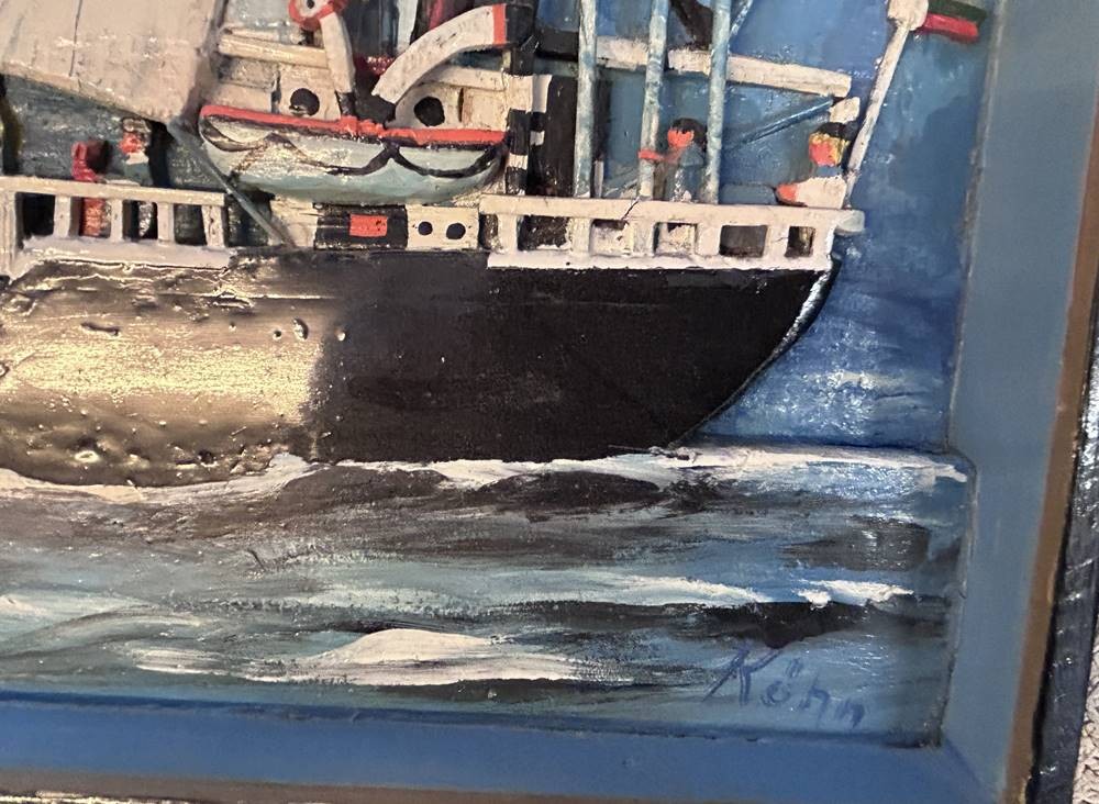 gr. Halbmodell eines Segelschiffes, Holz bemalt in Kasten, sign. Kühn, 60x74 cm [1]