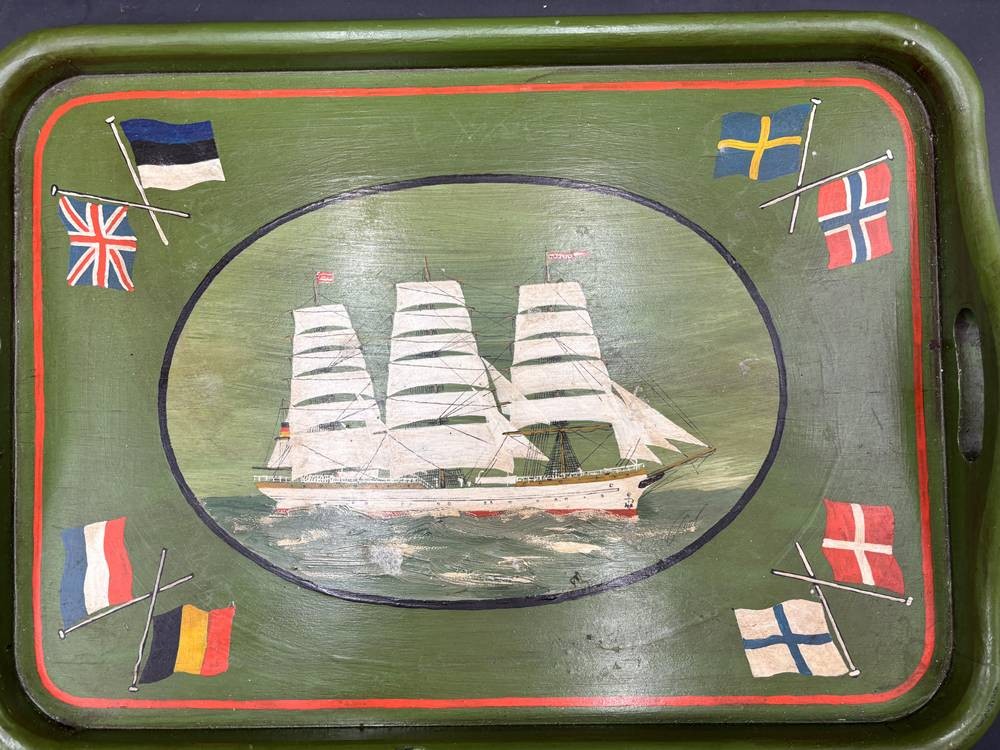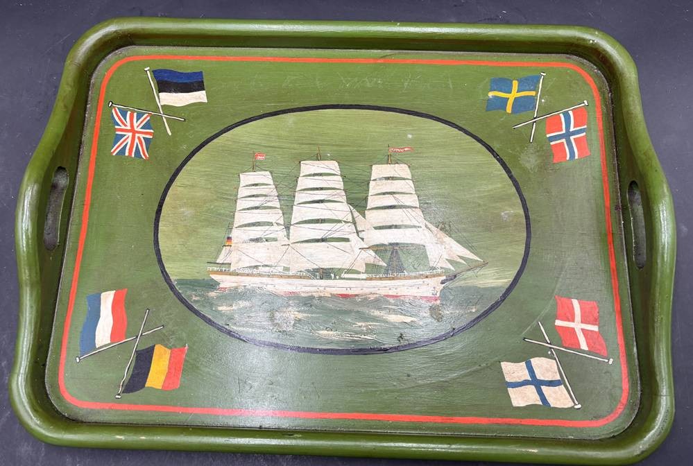 gr. Holz-Tablett, bemalt mit Segelschiff und Fahnen, 45x33 cm [1]