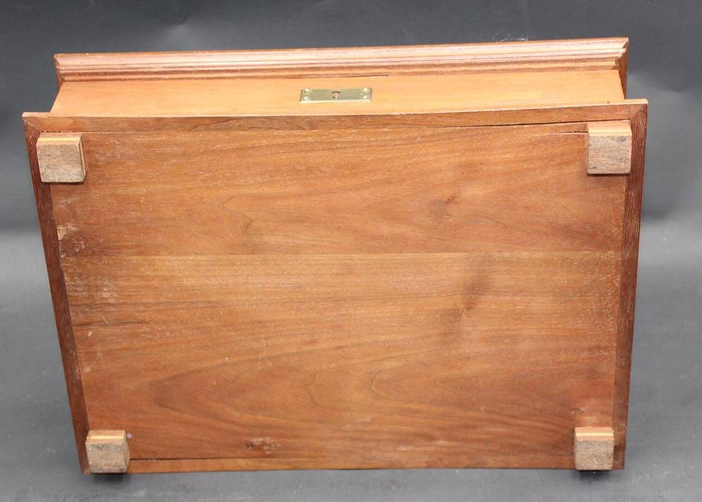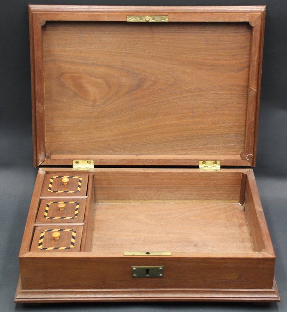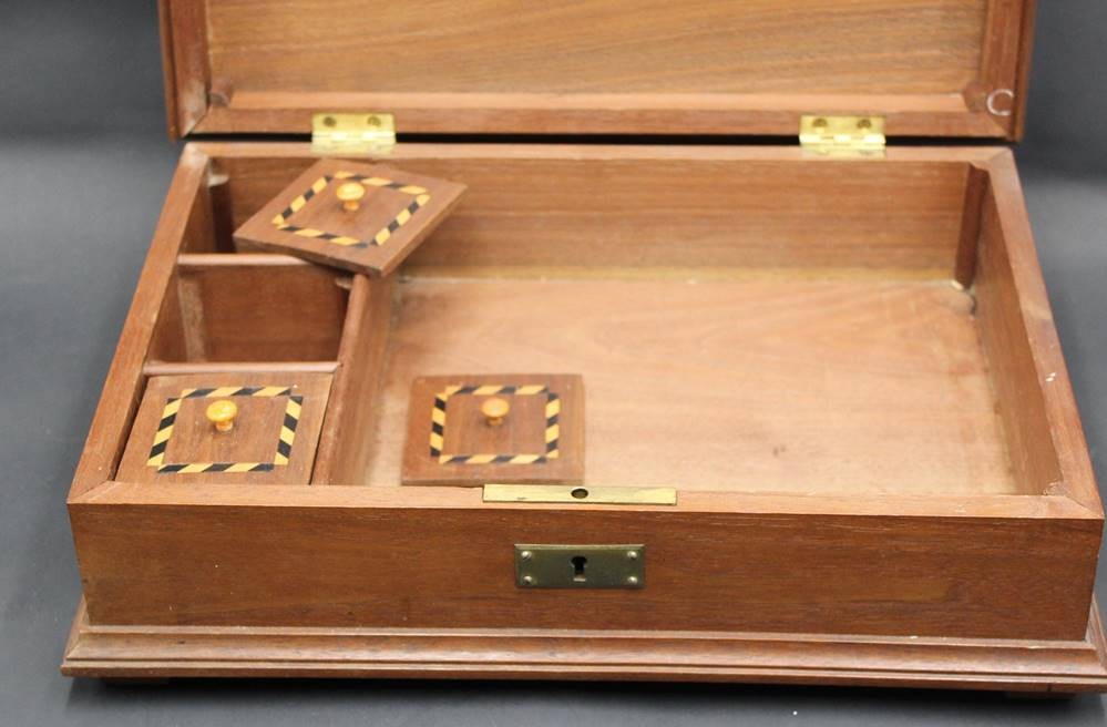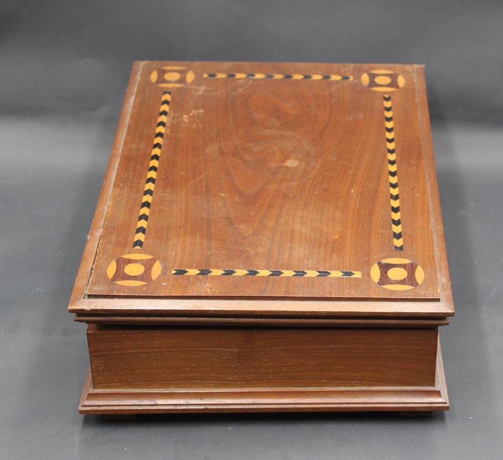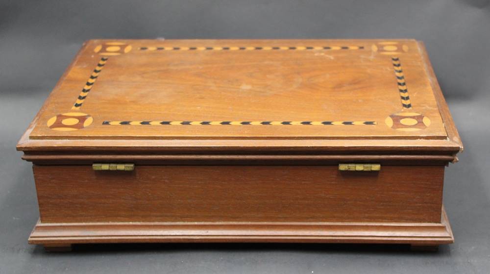 gr. Holzkasten, Deckel intarsiert, mit Inneneinteilung, H-9,5 cm, 25x35 cm [1]