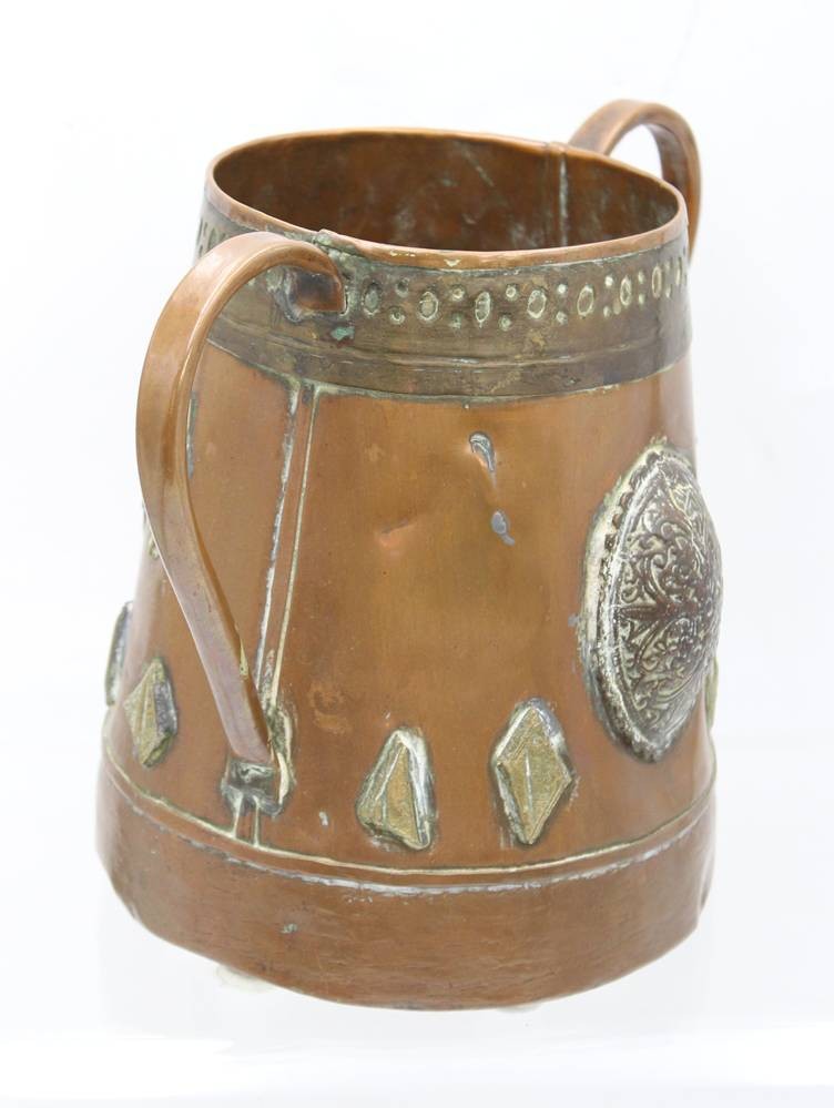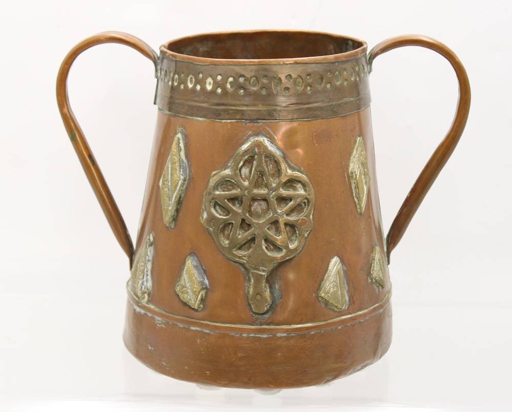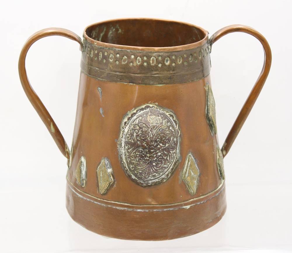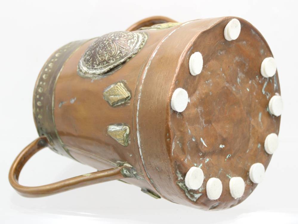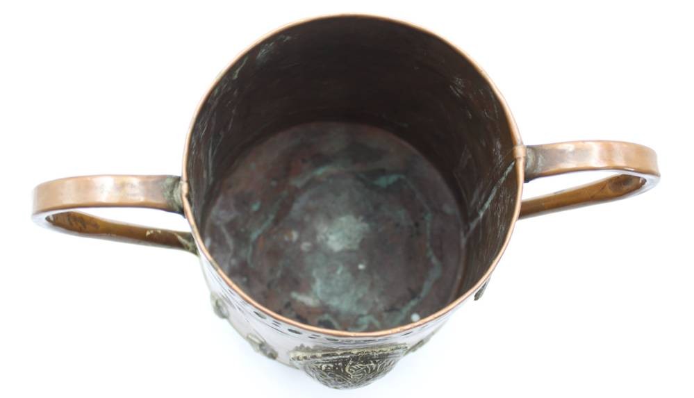 gr. Kupfer-Henkeltopf mit Messing-Applikationen, Herkunft?, Altersspuren, ca. H-23cm [1]