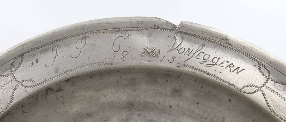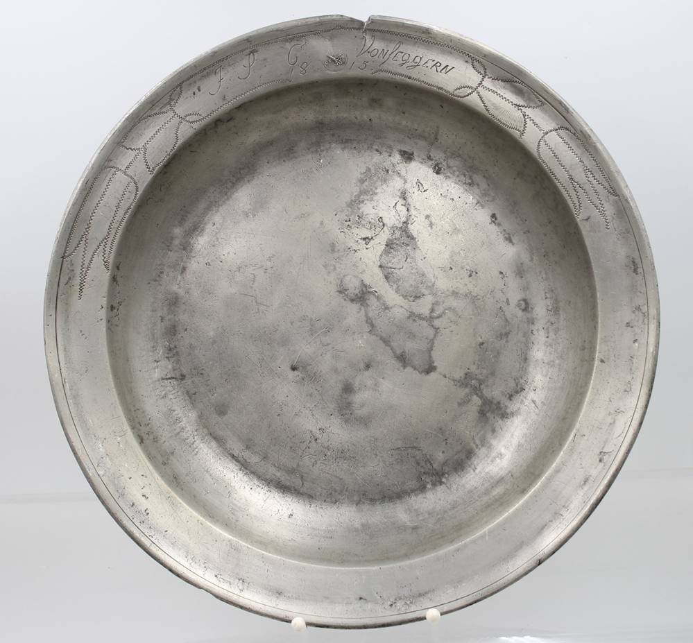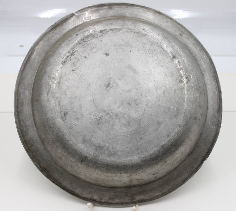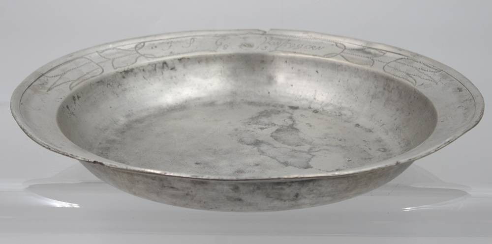 gr. runde Zinn-Schale, datiert 181 und Namensgravur, Altersspuren, D-37,5cm [1]