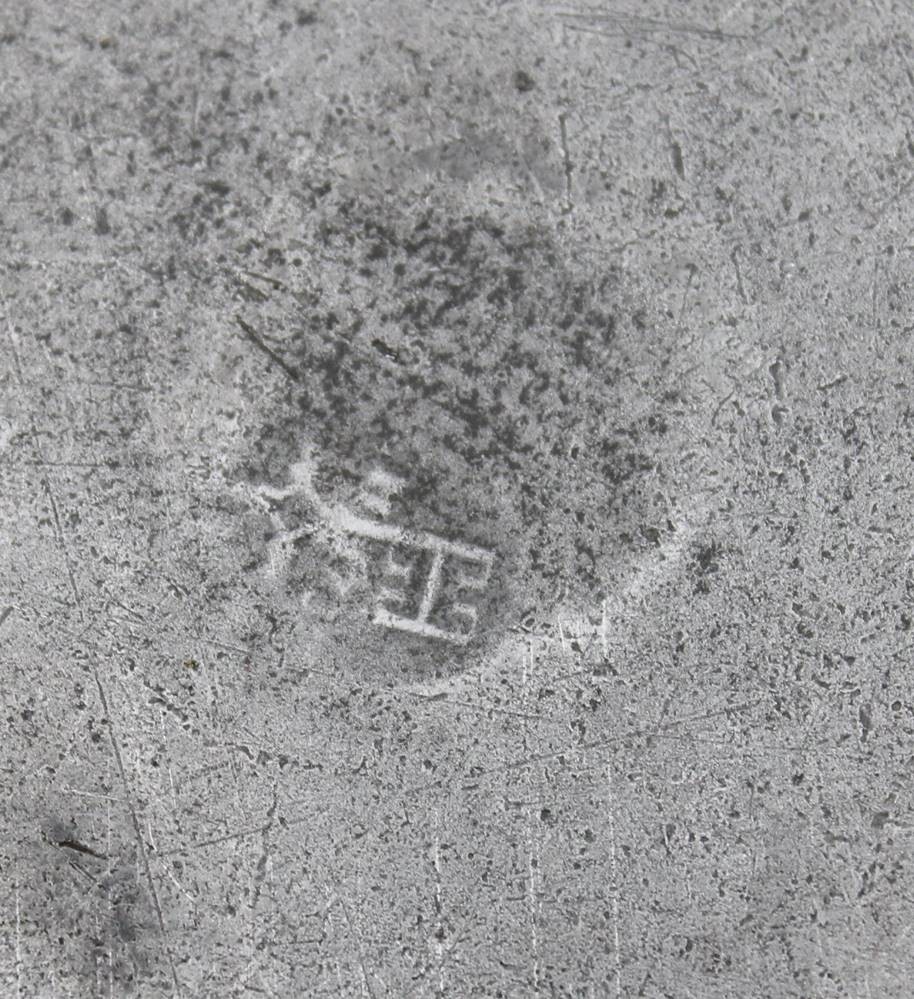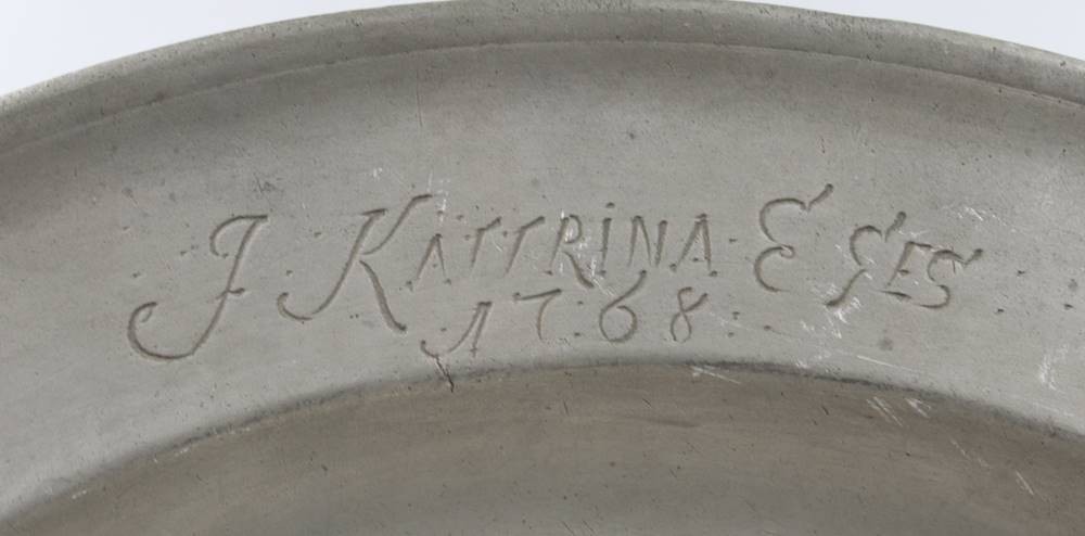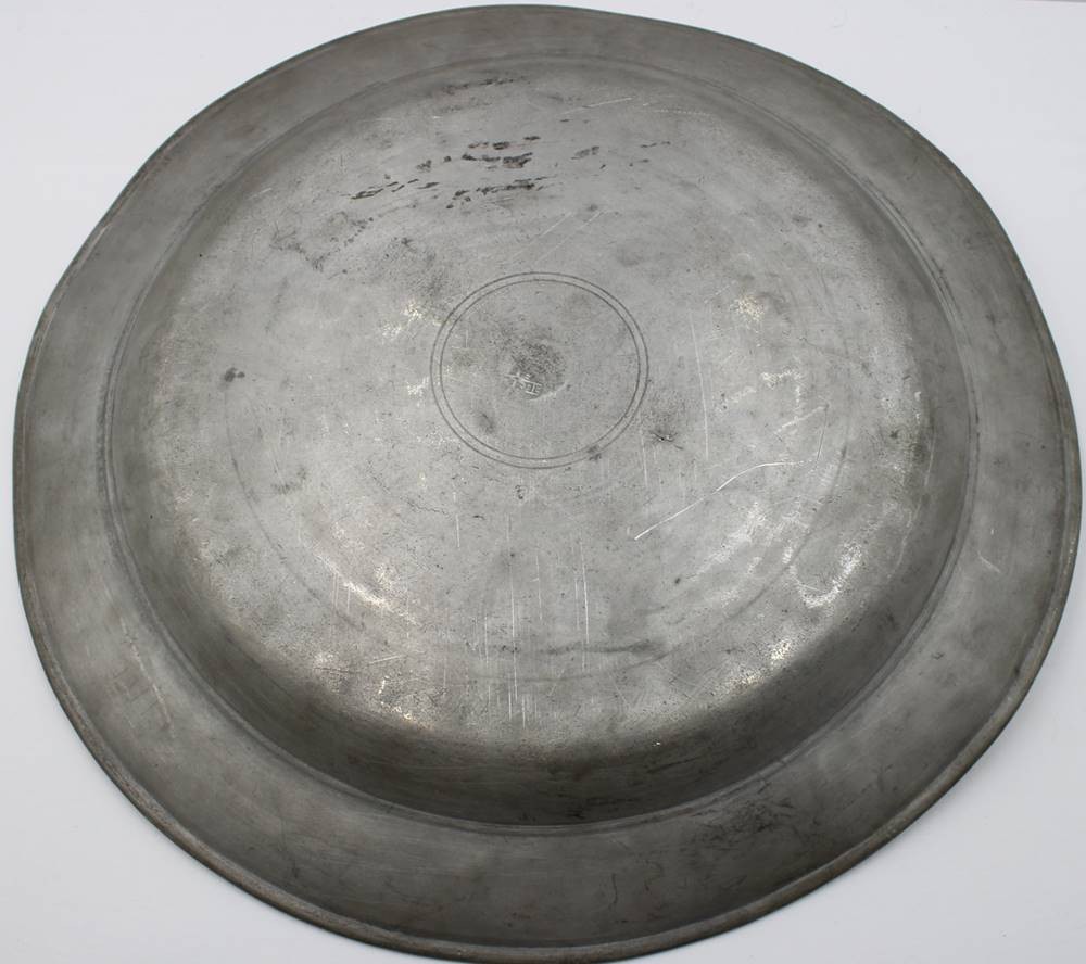 gr. runde Zinnplatte, Namensgravur und datiert 1768, Altersspuren. ca. D-43cm [1]
