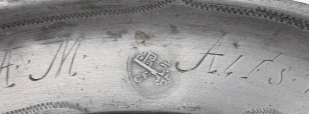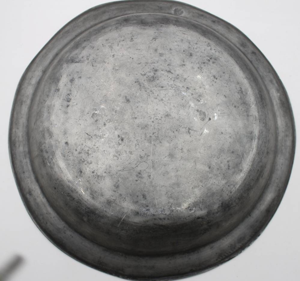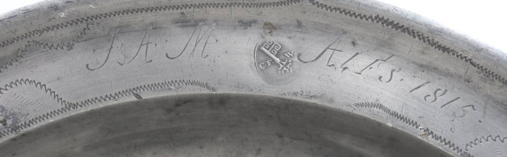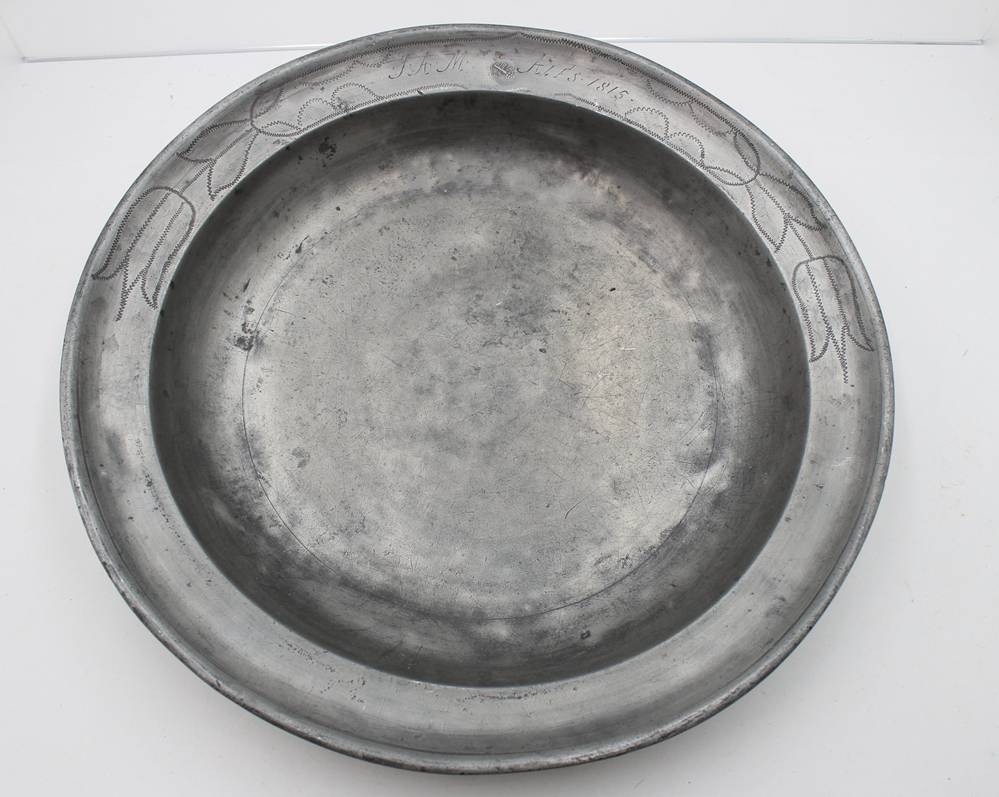 gr. runde Zinnschale, monogrammiert und datiert 1815, Altersspuren, H-6cm ca. D-38cm [1]