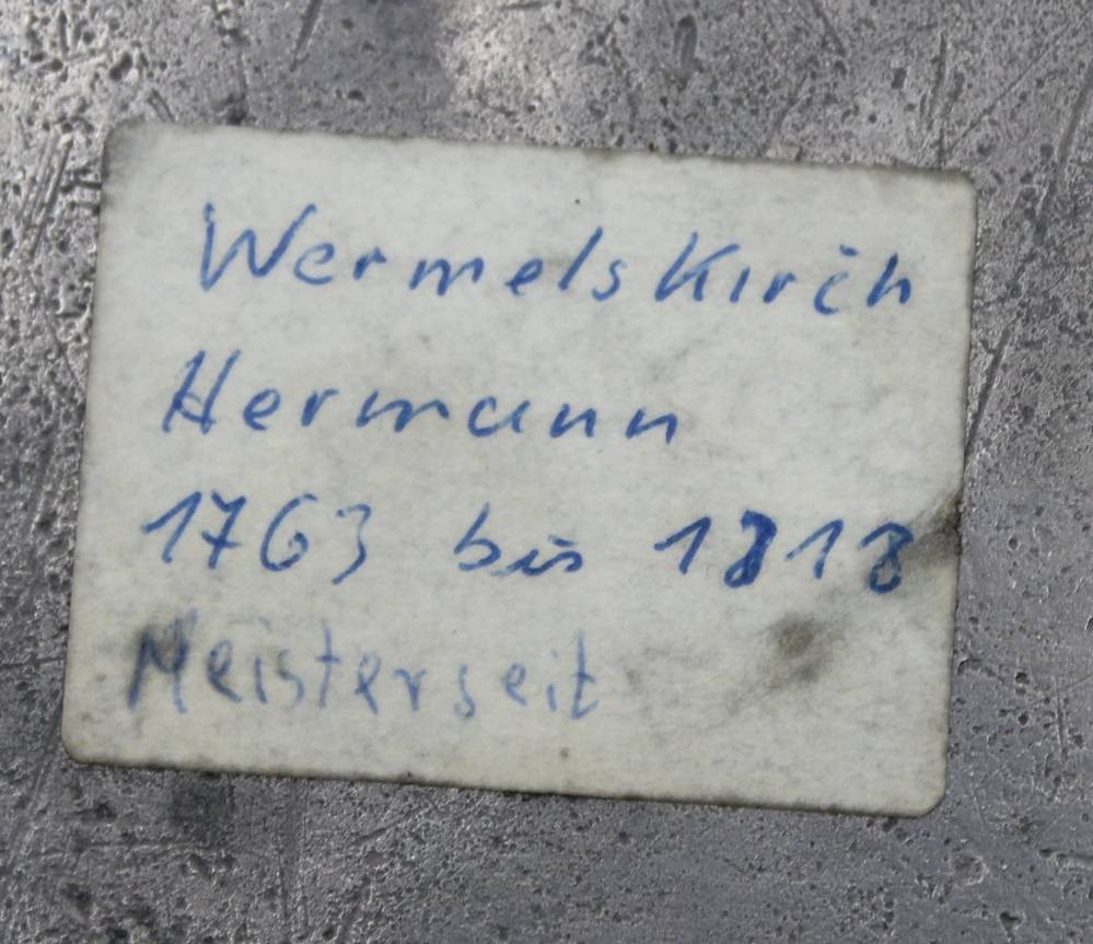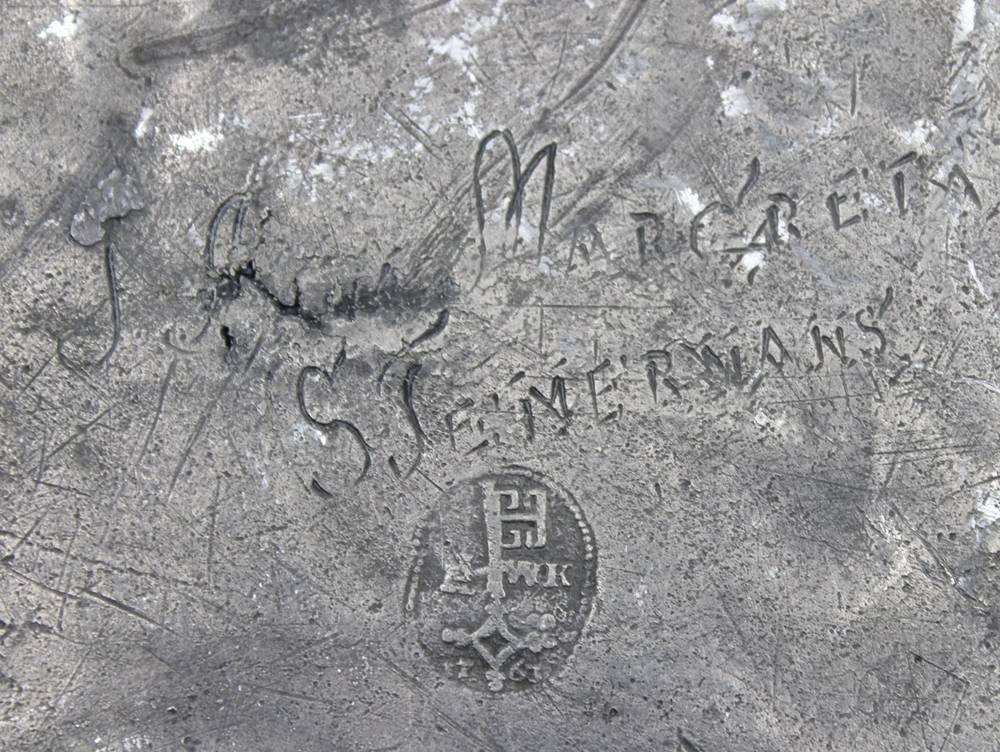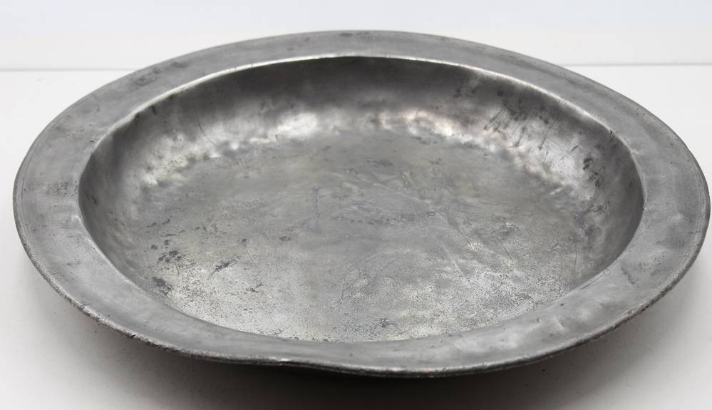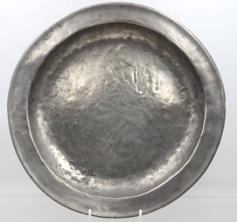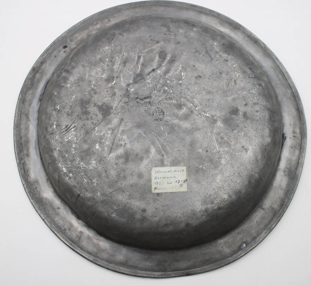 gr. runde Zinnschale, verso Etikett, Namensgravuren, Altersspuren, wohl 18./19. Jhd. , ca. H-5cm, D-39cm [1]