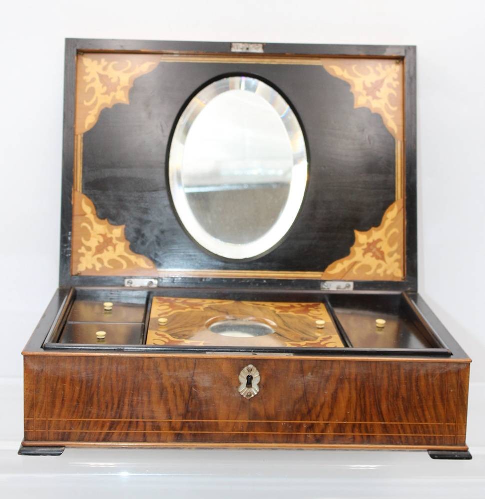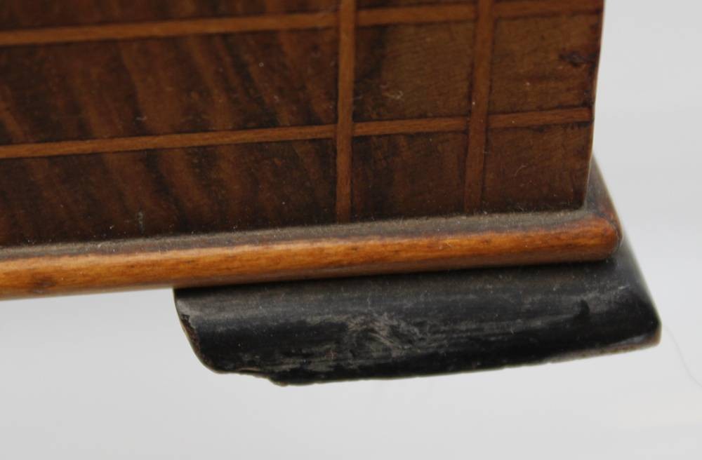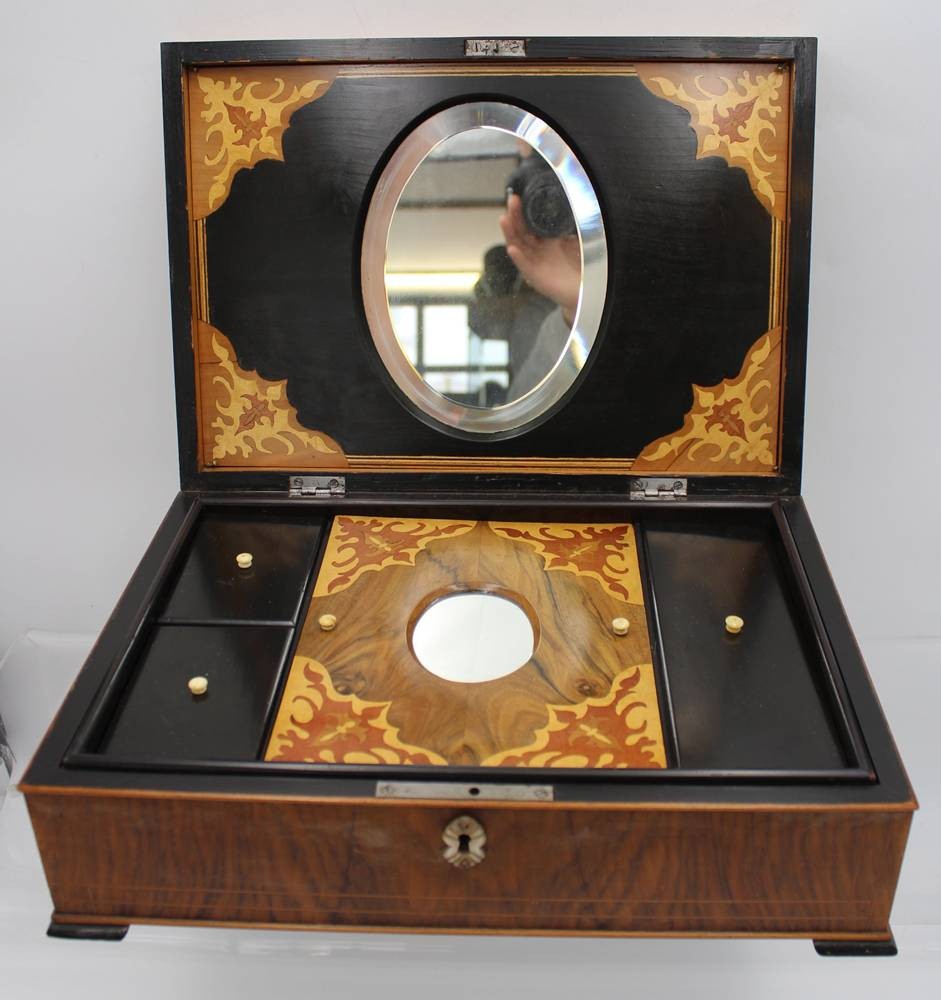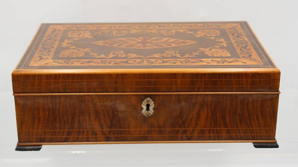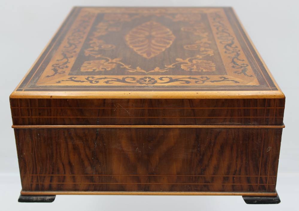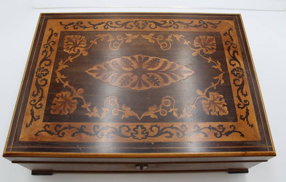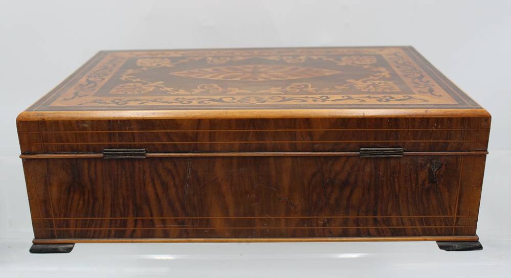 gr. schöner Schmuckkasten, intarsiert, wohl um 1900, innen Einteilung, Altersspuren, H-6,5cm B-35cm T-25cm [1]