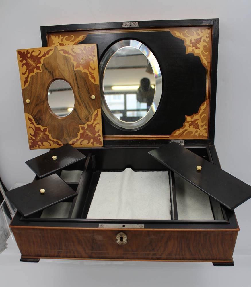 ![Auktion 362<br>gr. schöner Schmuckkasten, intarsiert, wohl um 1900, innen Einteilung, Altersspuren, H-6,5cm B-35cm T-25cm [1] Auktion 362<br>gr. schöner Schmuckkasten, intarsiert, wohl um 1900, innen Einteilung, Altersspuren, H-6,5cm B-35cm T-25cm [1]](images/item_images/item/83128_0.jpg?t=20250829_165349)