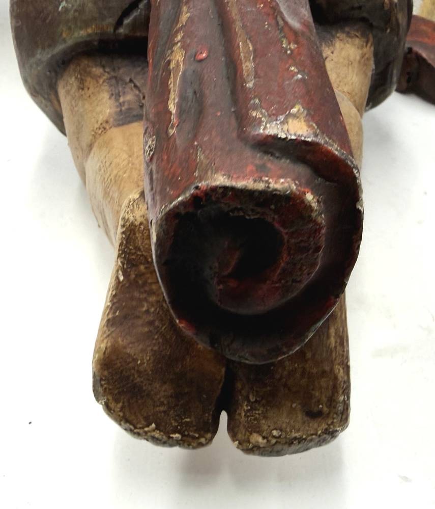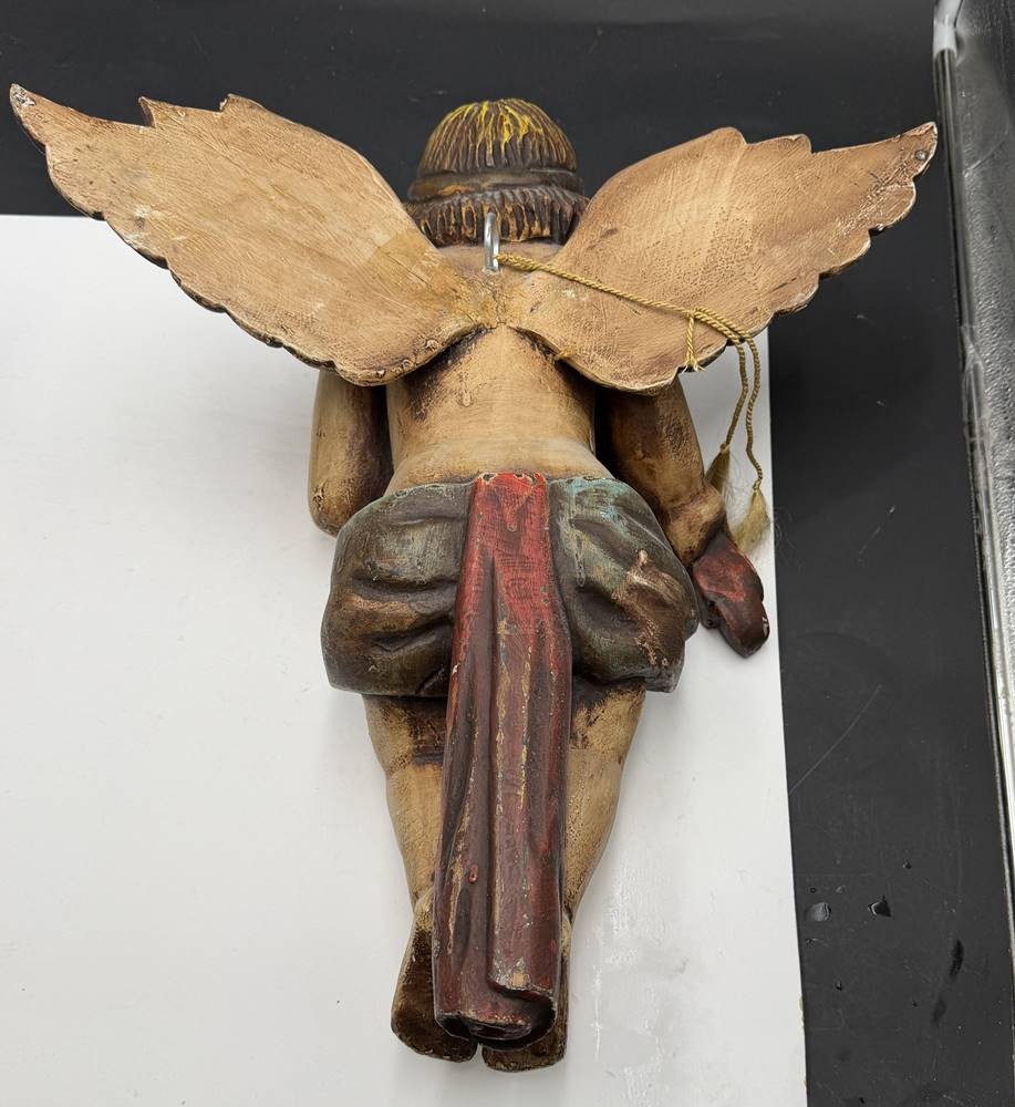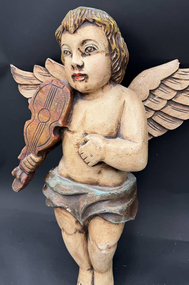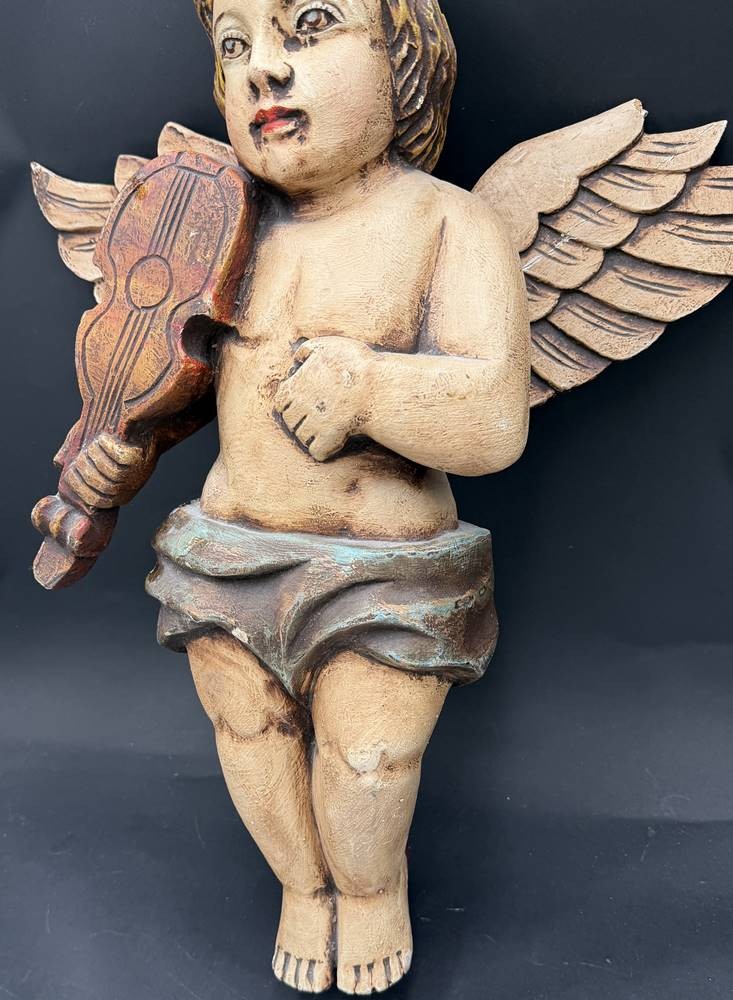 gr. Wandputto mit Geige, Prtessholz, farbig gefasst, kl. Abplatzer etc, Bogen fehlt, H-48 cm, B-43 vm [1]