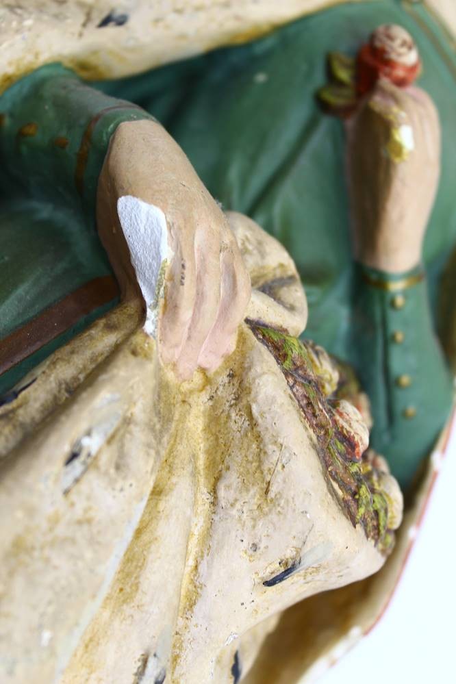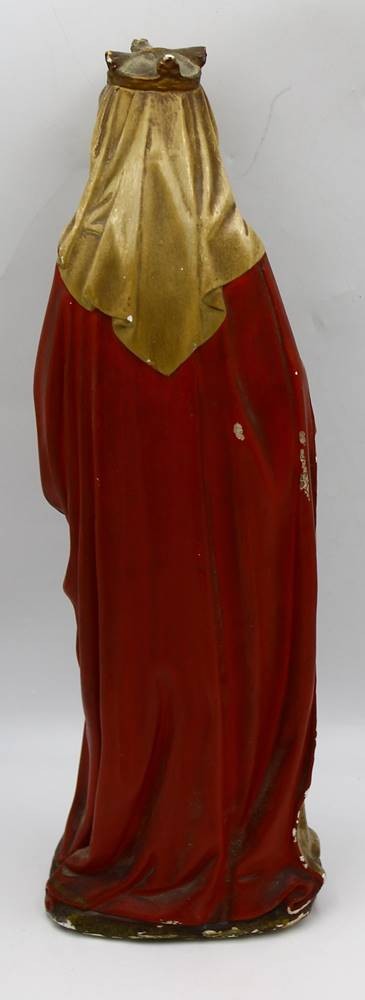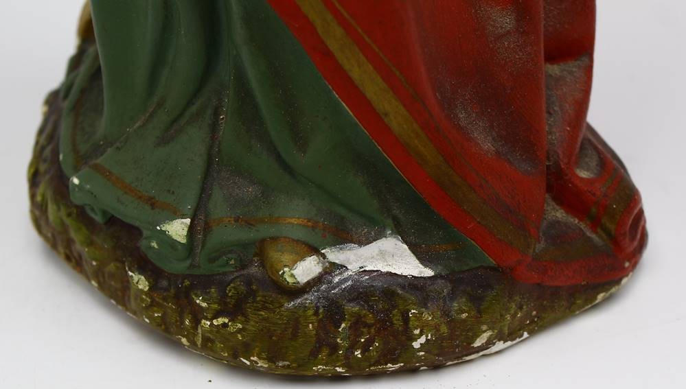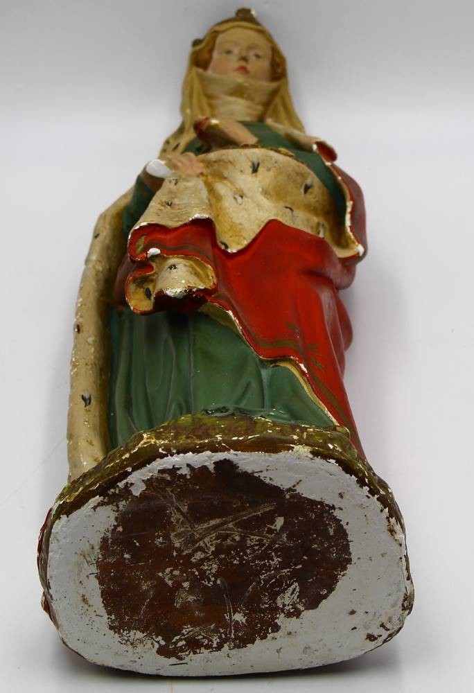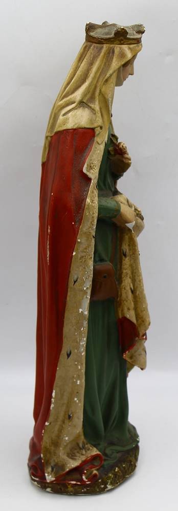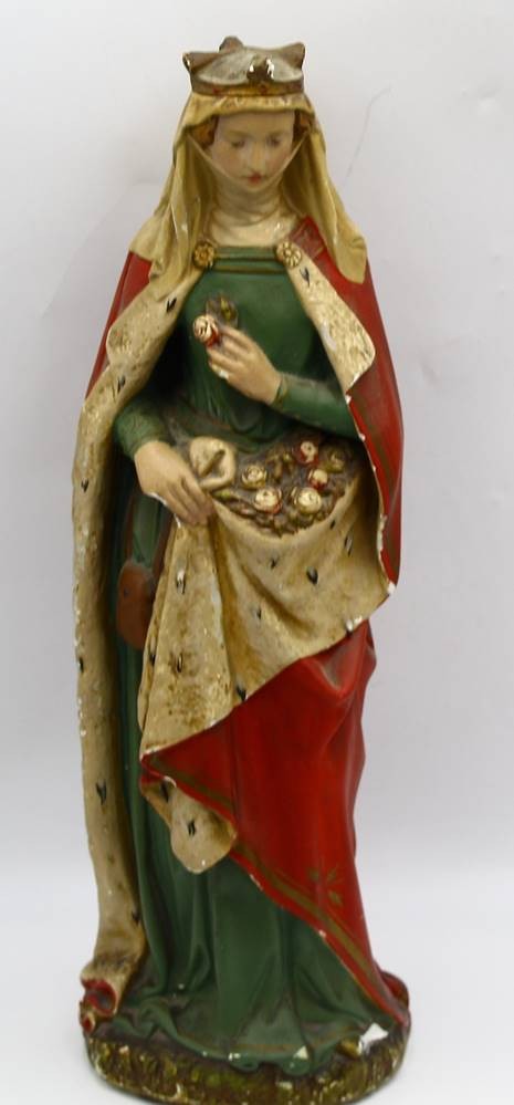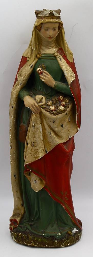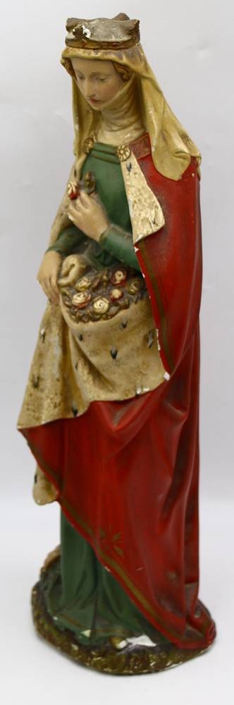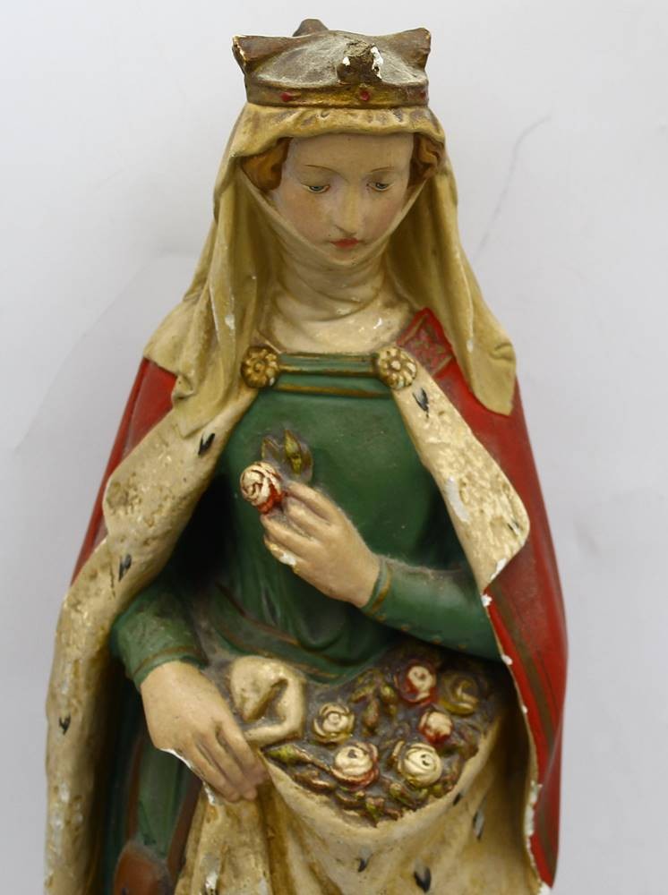 hohe Stuck Staue der Hl. Elisabeth von Ungarn, farbig gefasst, mit Wandkonsole, H-54 cm, kl. Abplatzer an Händen etc., Schutzpatronin unter anderem der Bäcker, Obdachlosen, Krankenhäuser und Witwen. [1]