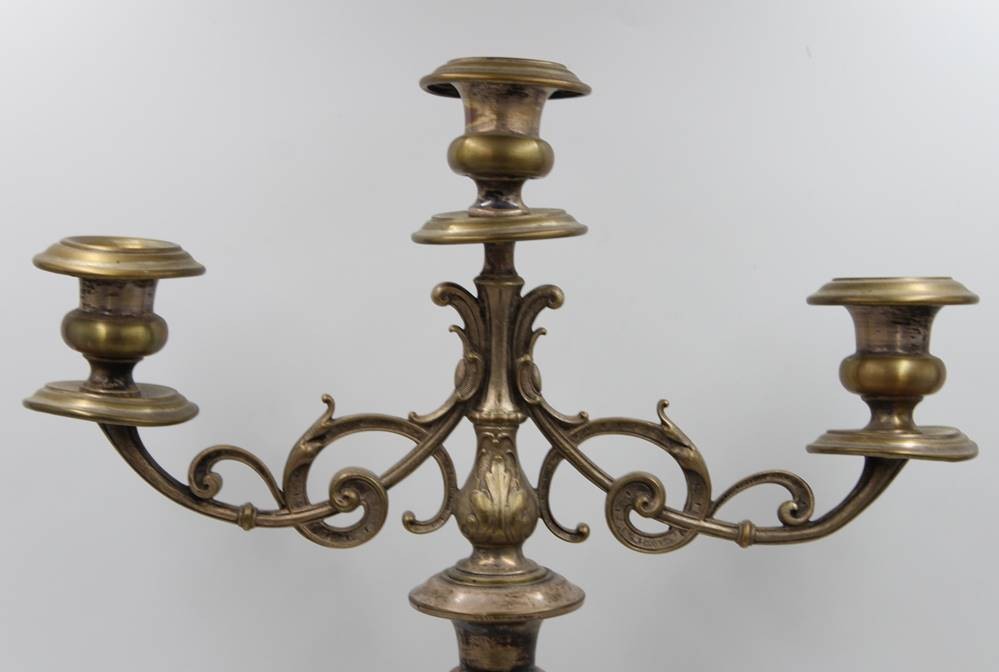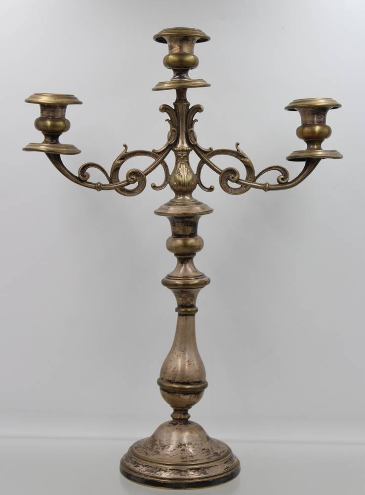 hoher Leuchter, 3flammig, 19. Jhd., Altersspuren, 2tlg., ca. H-41cm B-29cm [1]