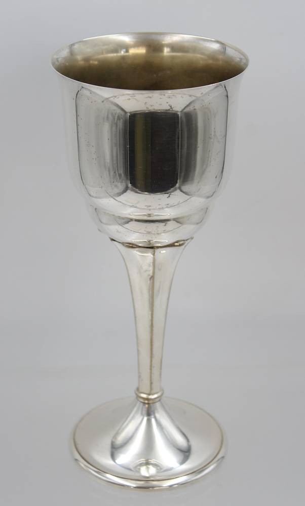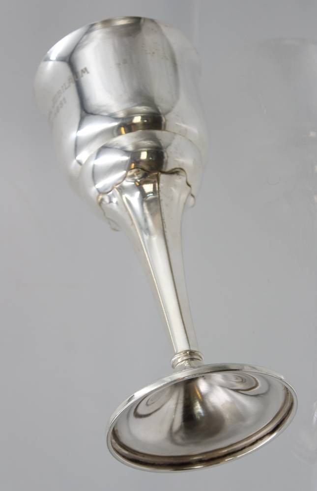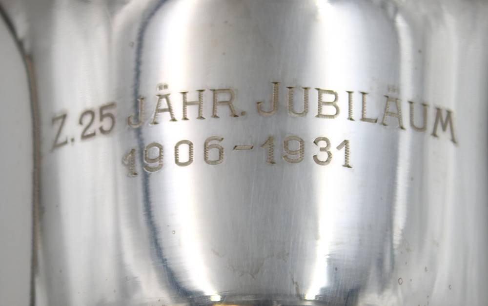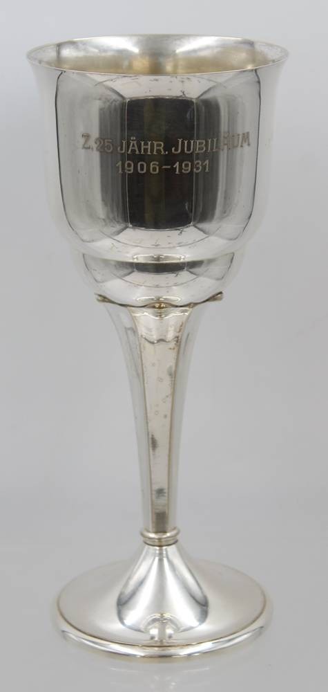 hoher Pokal auf Stand, Gravur "Z. 25. Jähr. Jubiläum 1906-1931", Messing versilbert, ca. H-.23,8cm. [1]