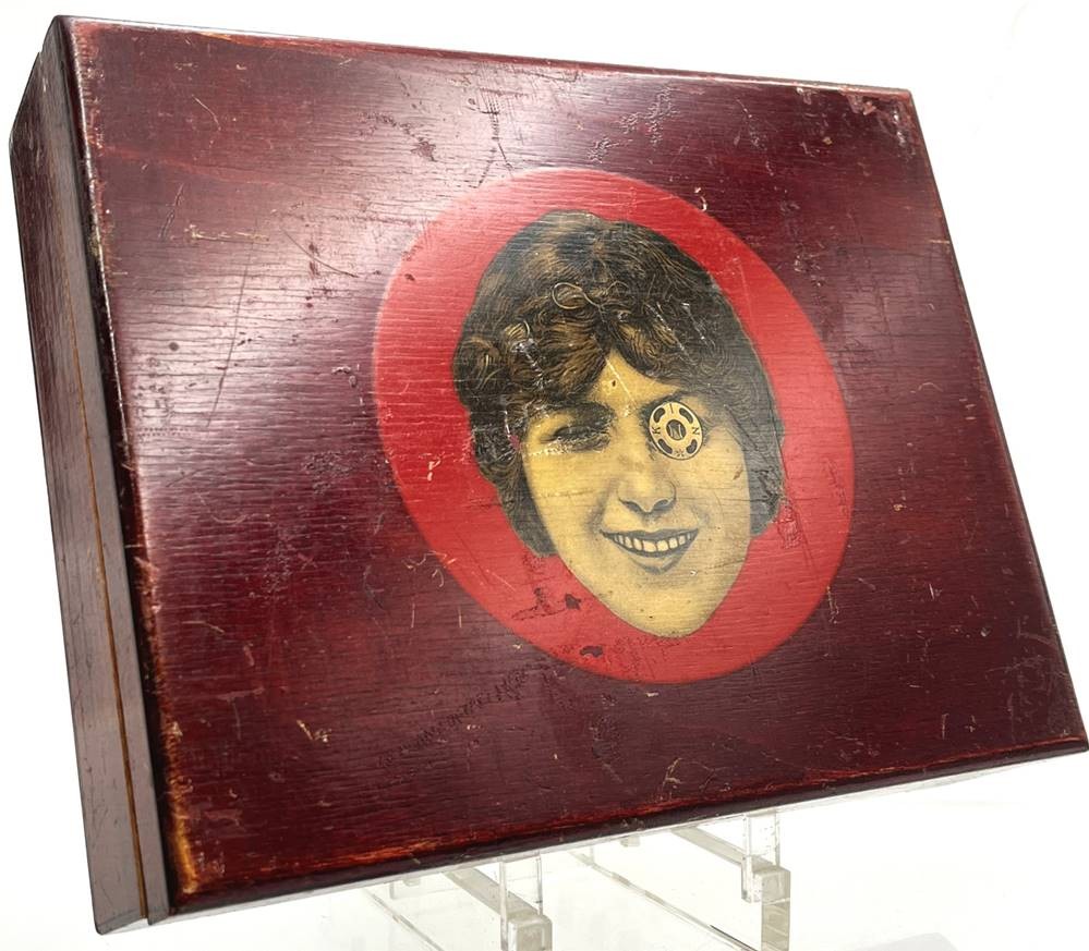 Holzkasten mit Mädchengesicht "Koh-I-Noor" Druckknöpfe, H-5 cm, 17x22 cm