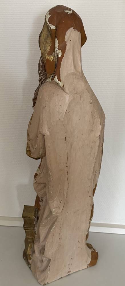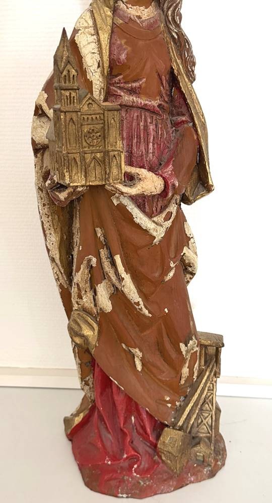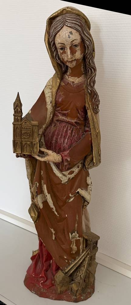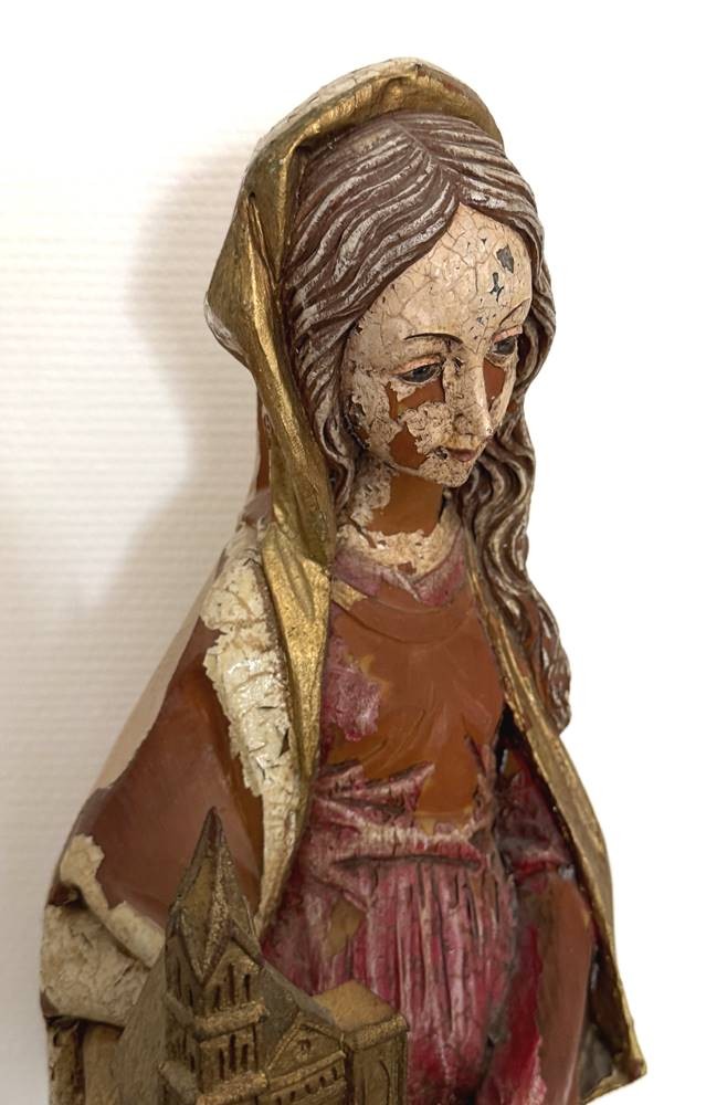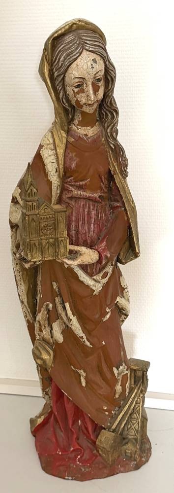 Holzstatue der Hl. Barbara, 19.Jhd?, wohl Lindenholz mit Resten alter Fassung, H-65 cm [1]