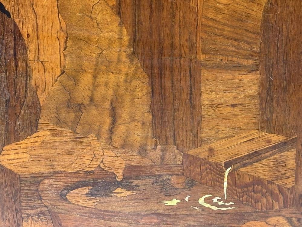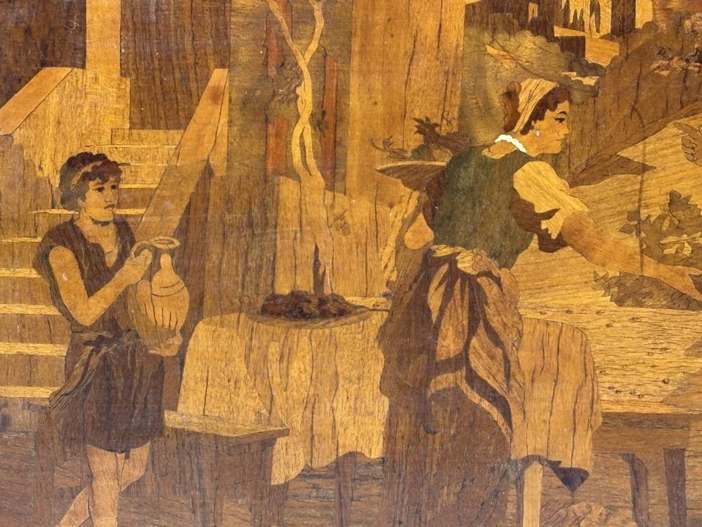 Intarsienbild ""Christus bei Maria und Martha" , verso Etikette -Edelhölzer-Perlmutt, "Rob. Julius Jacoby" Korntal, 45x60 cm