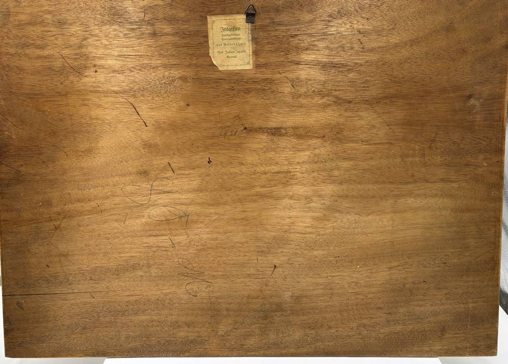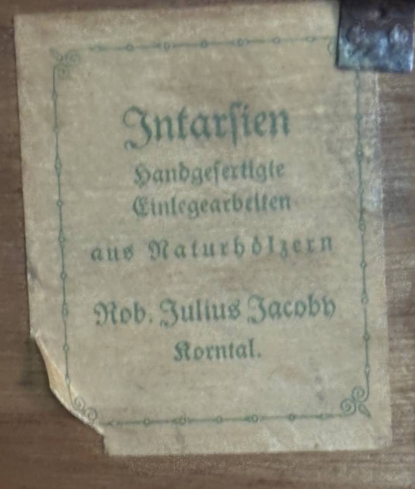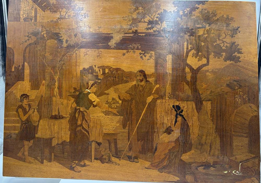 Intarsienbild ""Christus bei Maria und Martha" , verso Etikette -Edelhölzer-Perlmutt, "Rob. Julius Jacoby" Korntal, 45x60 cm [1]