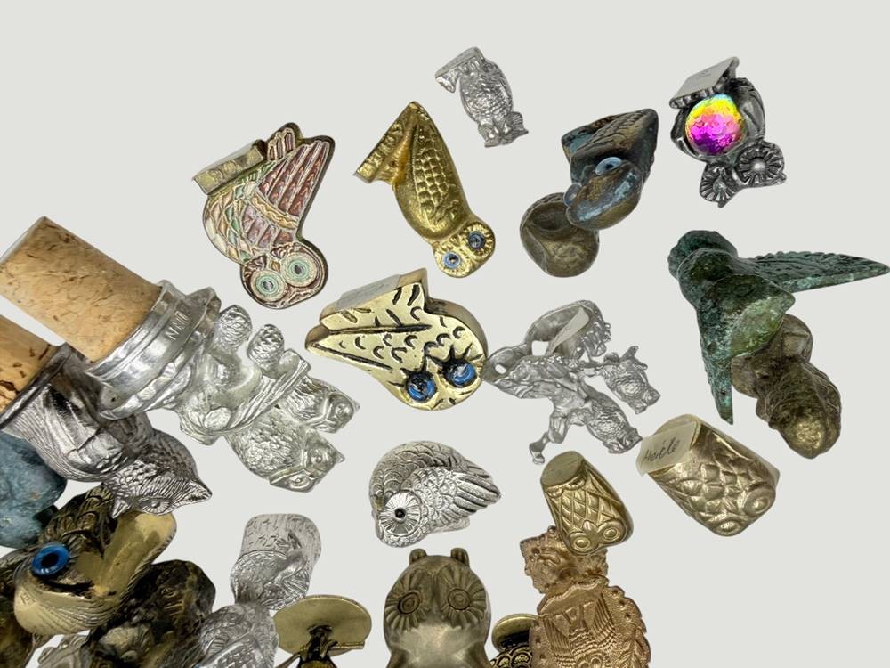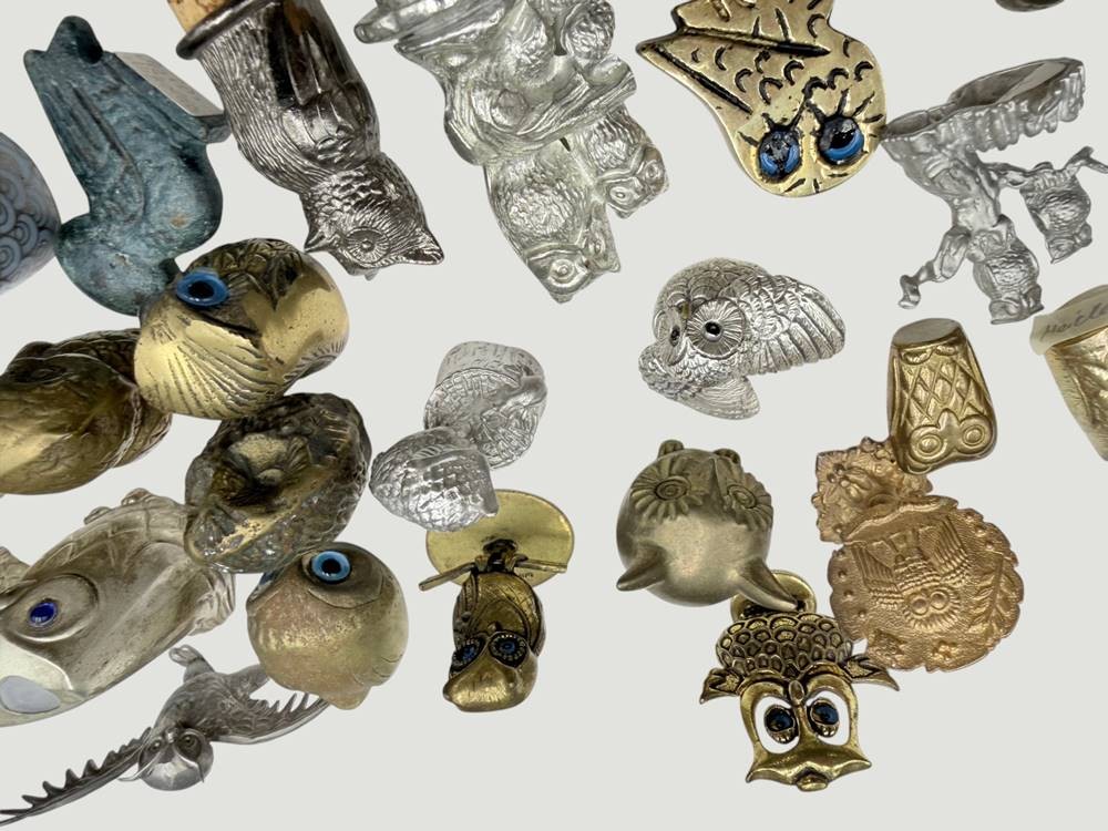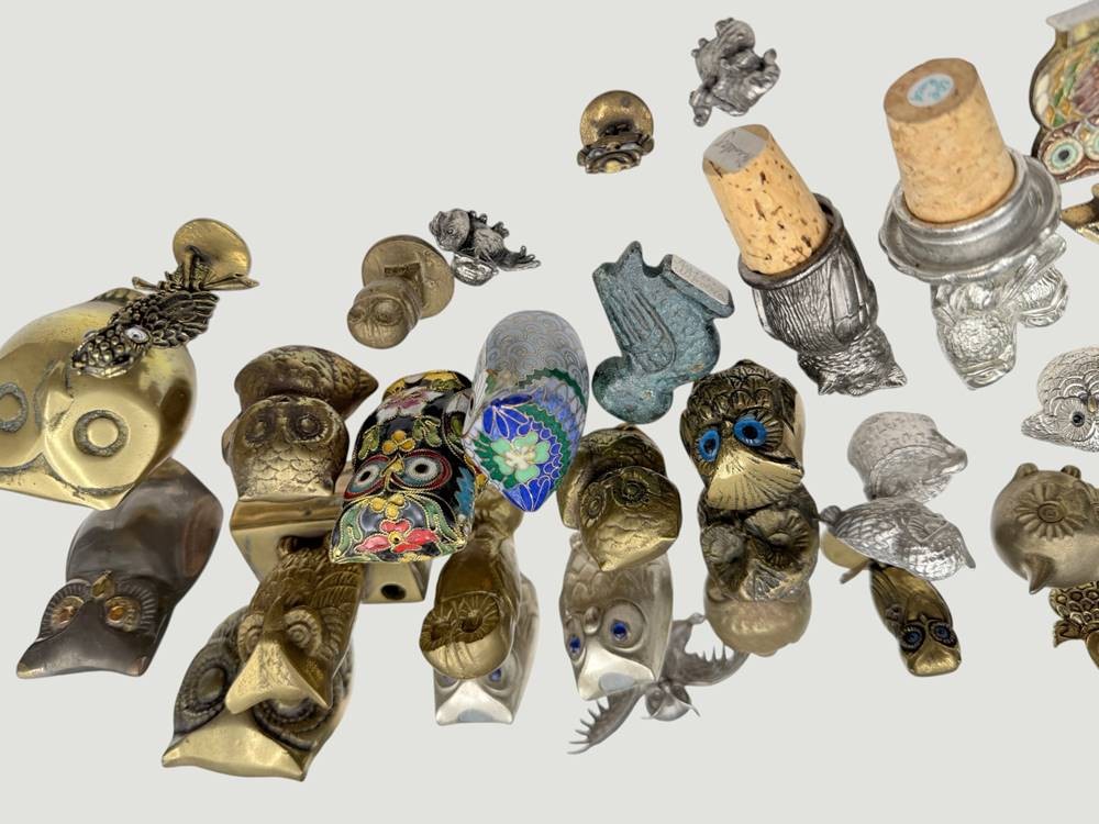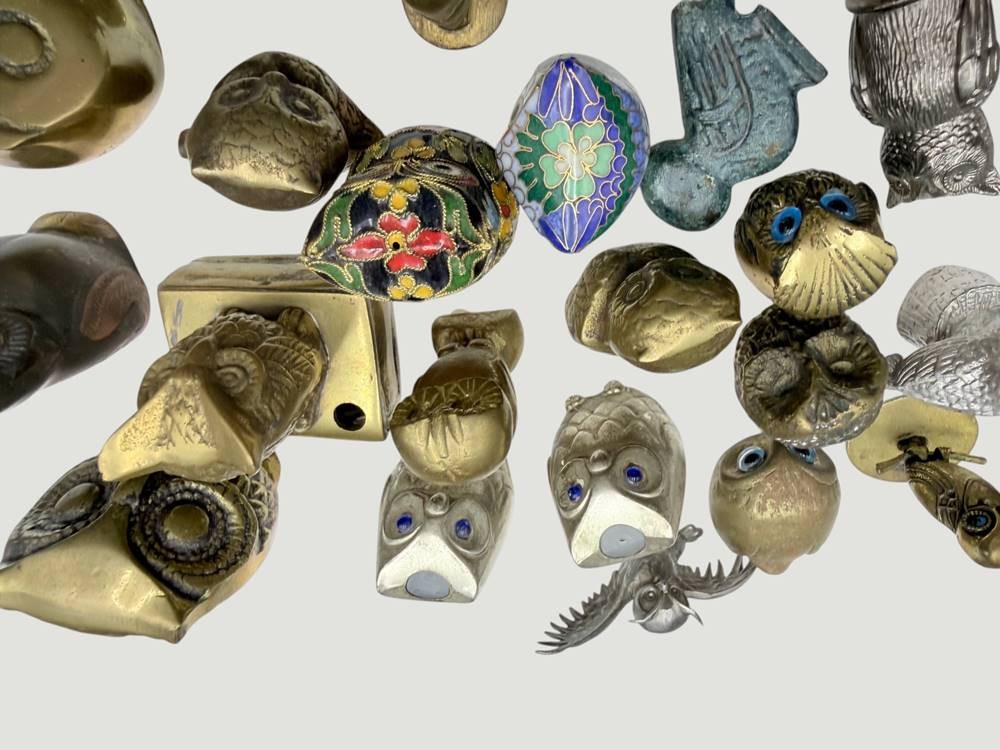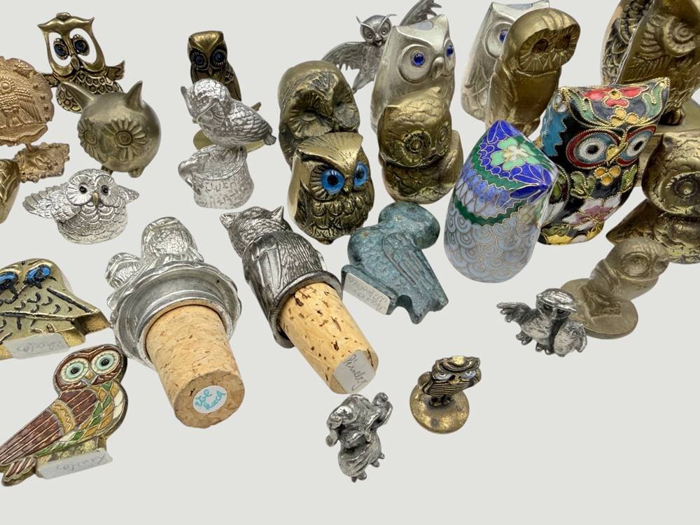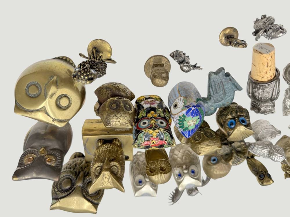 Karton mit 41 diversen Eulenfiguren, Messing/Bronze/Metall, 2x emailliert [1]