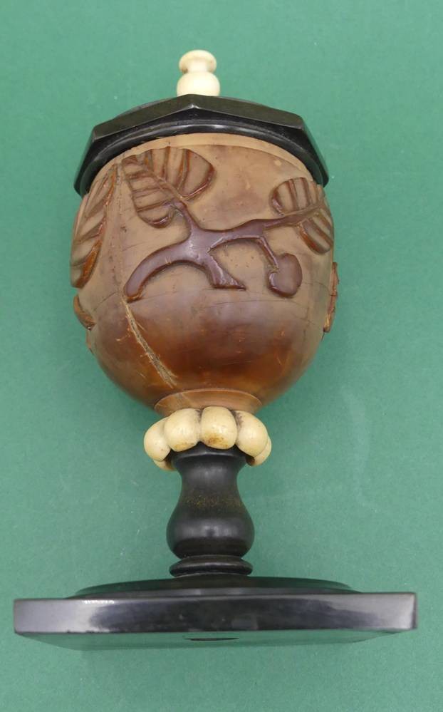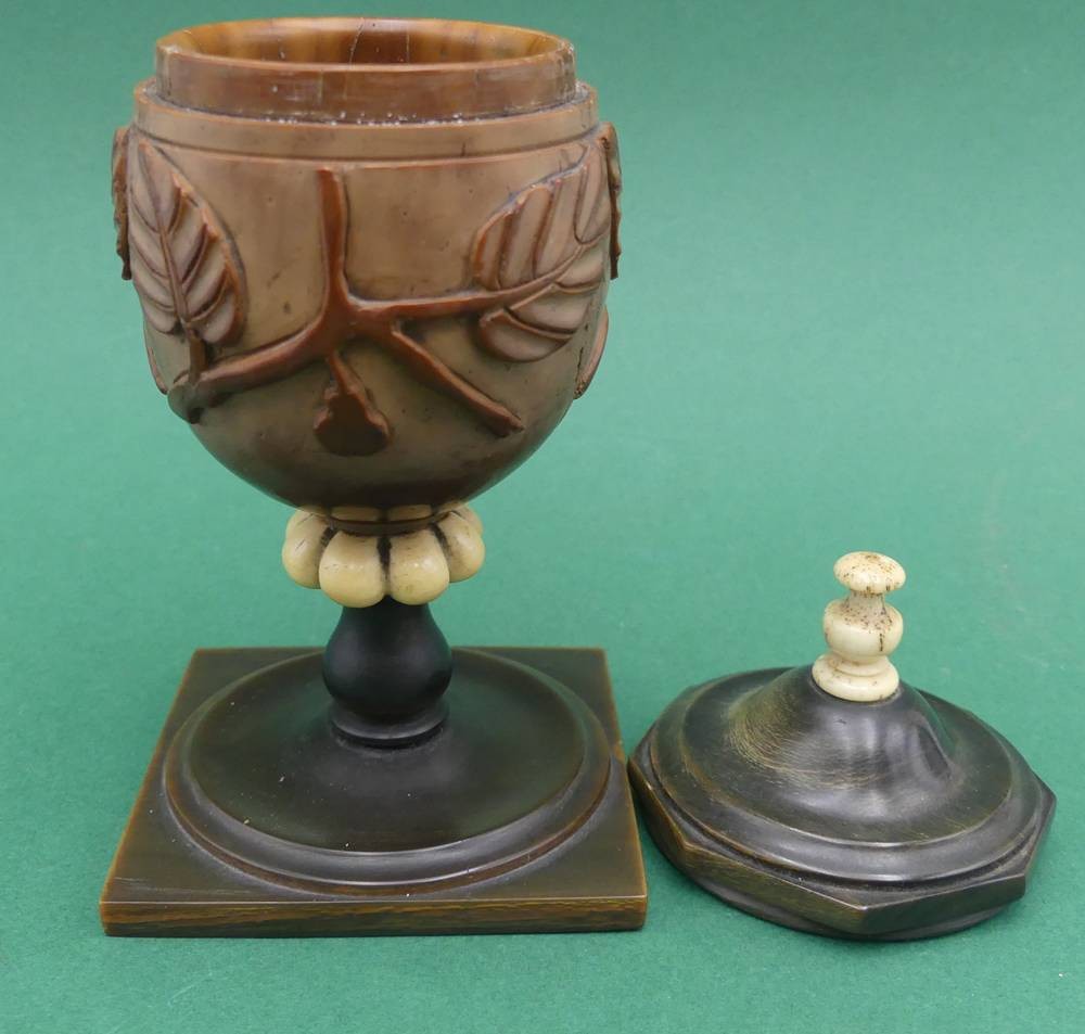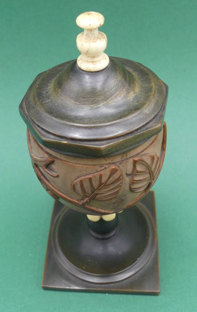 kl. Deckeldose aus beschnitzter Coquilla-Nuss mit Horn Stand und Deckel, 19.Jhd., H-12 cm [1]