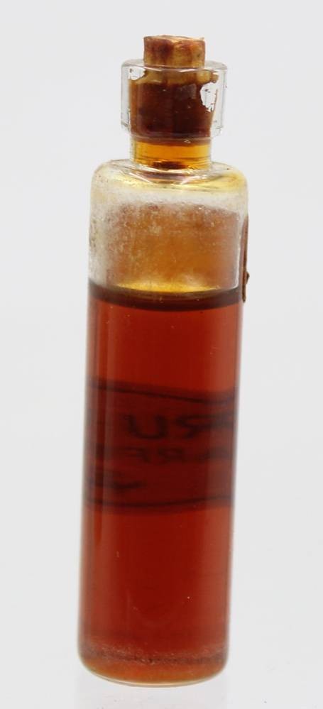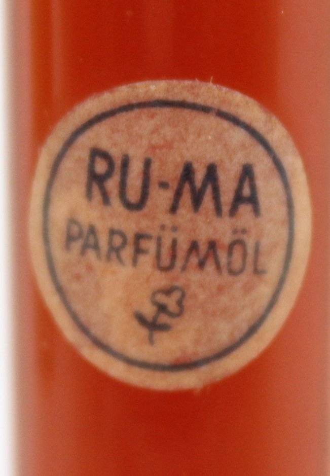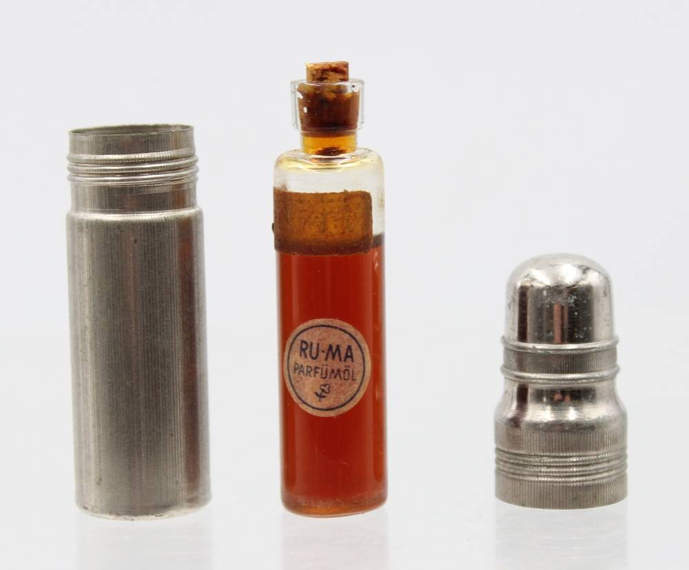 kl. Flacon o.ä., älter, innen Fläschenchen "Ru-Ma Parfümöl", ca. L-6,5cm [1]