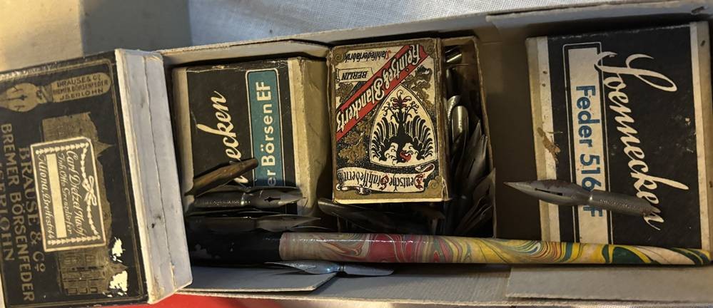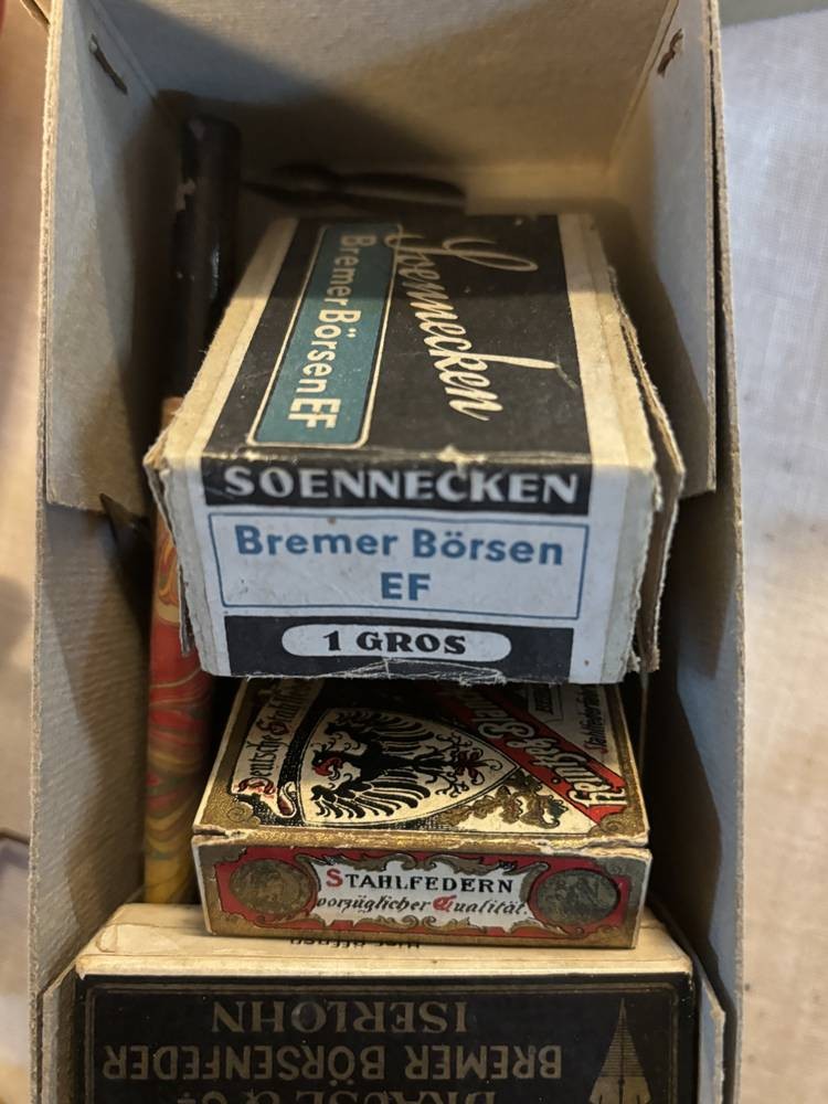 kl. Karton voller Stahlfedern für Federkiele etc., Soennecken und andere (Eine Schachtel enthält "1 Gros", was zwölf Dutzend, also 144 Stück, entspricht.) Vollständigkeit nicht geprüft [1]