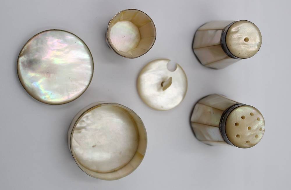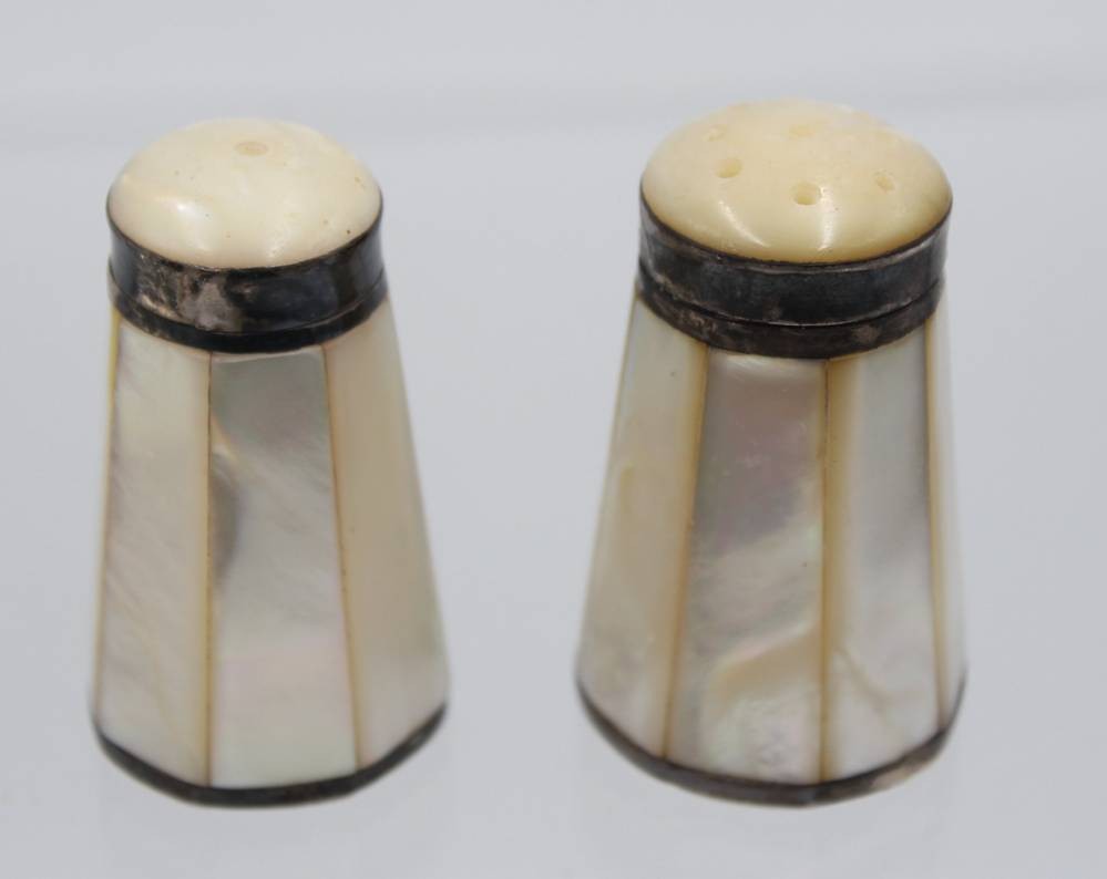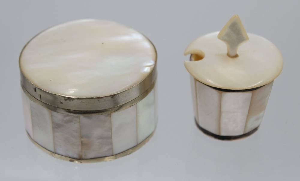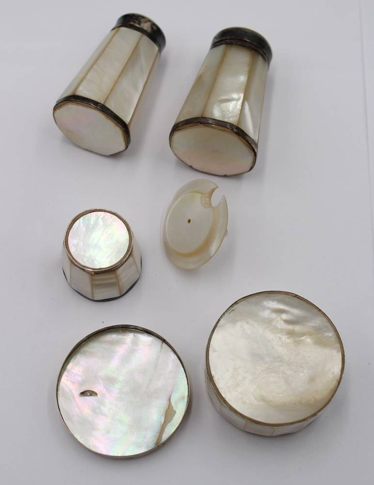 kl. Konvolut Perlmutt, Streuerpaar, Gewürzschälchen und kl. Deckeldose, älter, ca. H-6cm, Dose D-5cm [1]