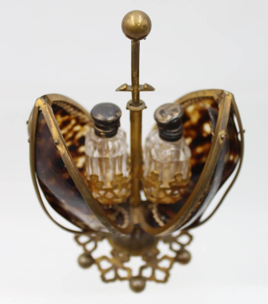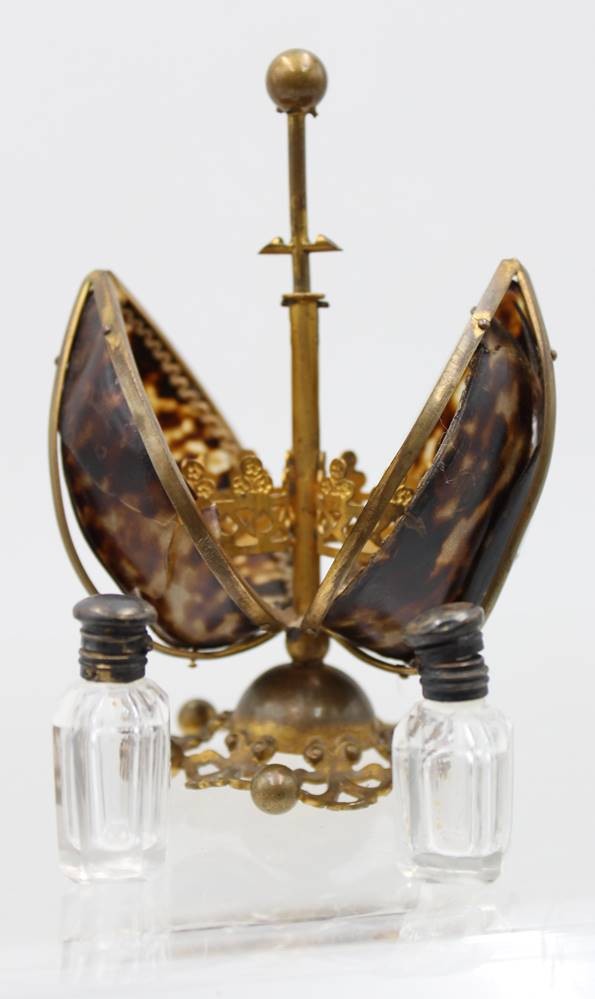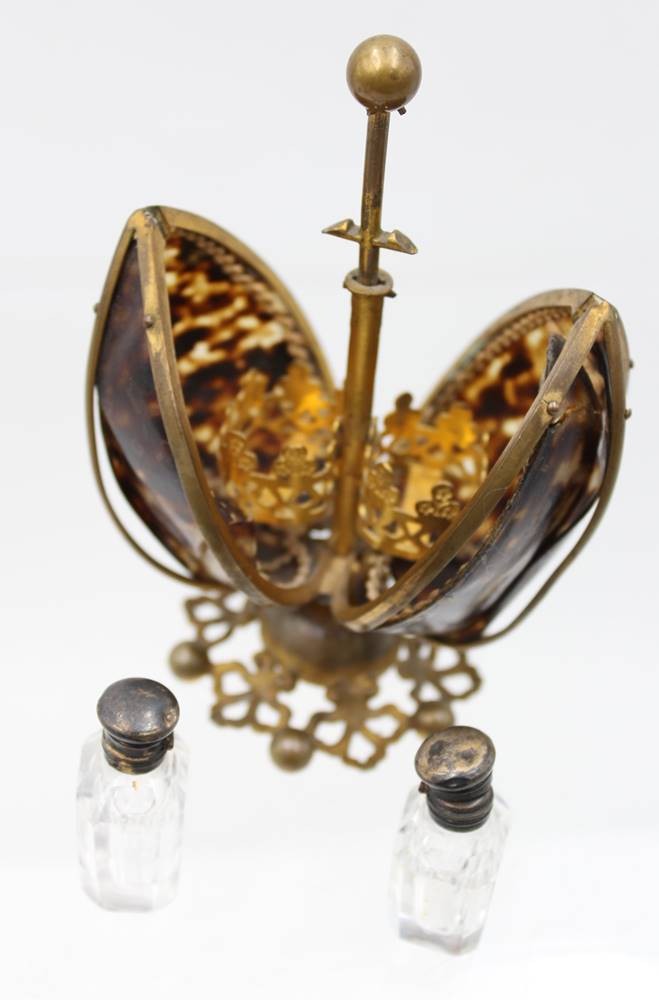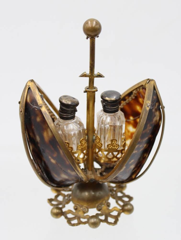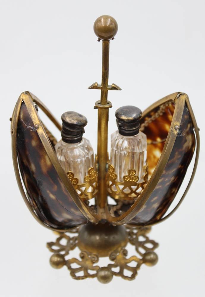 kl. Menage mit klappbarer Schildpatt--Hülle, diese beschädigt, 2 Mini-Flacons, Kristall mit Silberdeckel, wohl Mitte 19.Jhd. [1]